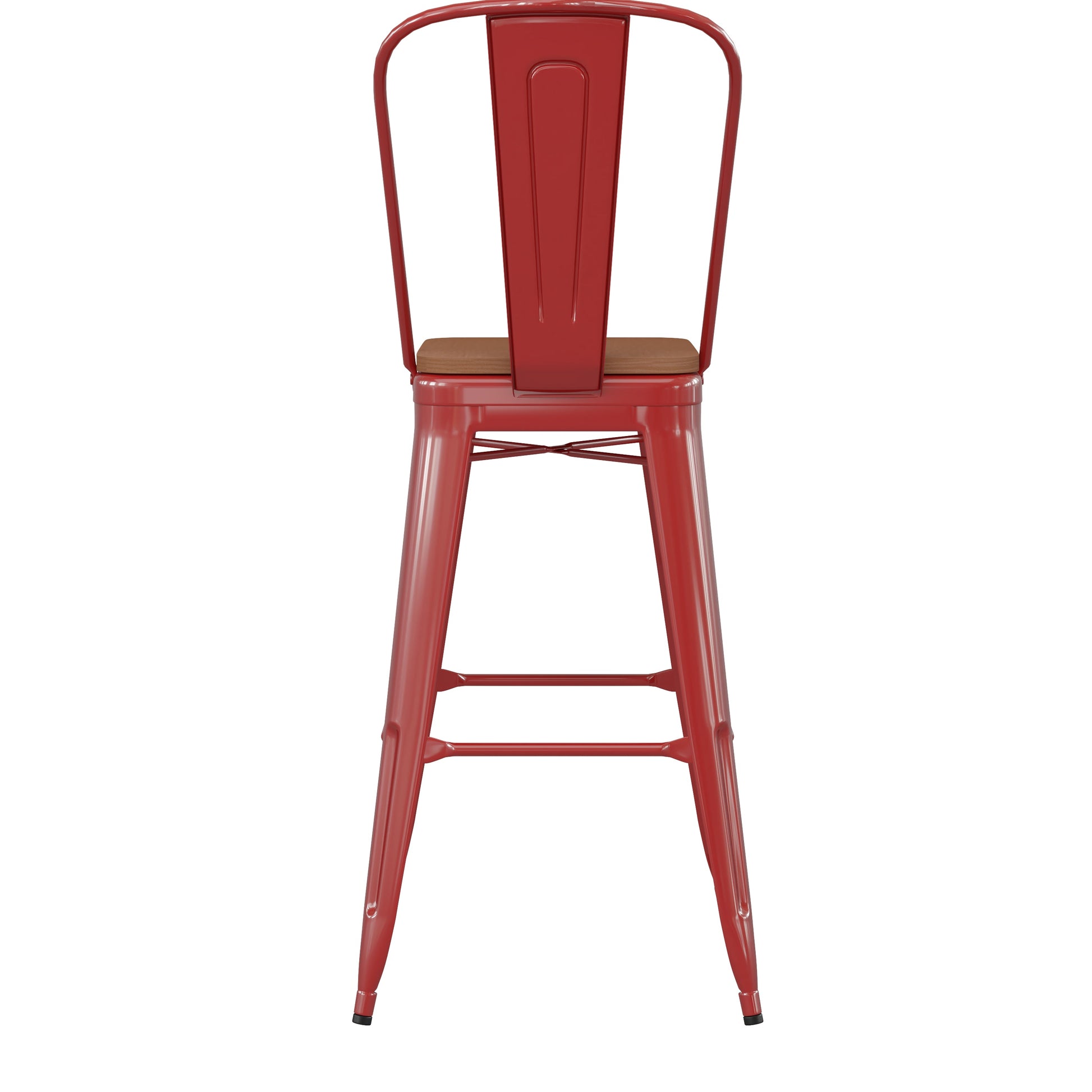 Kai Commercial Grade 30" High Red Metal Indoor-Outdoor Bar Height Stool with Removable Back and Teak All-Weather Poly Resin Seat Dimensions: 17.75"W x 20"D x 45.25"H
