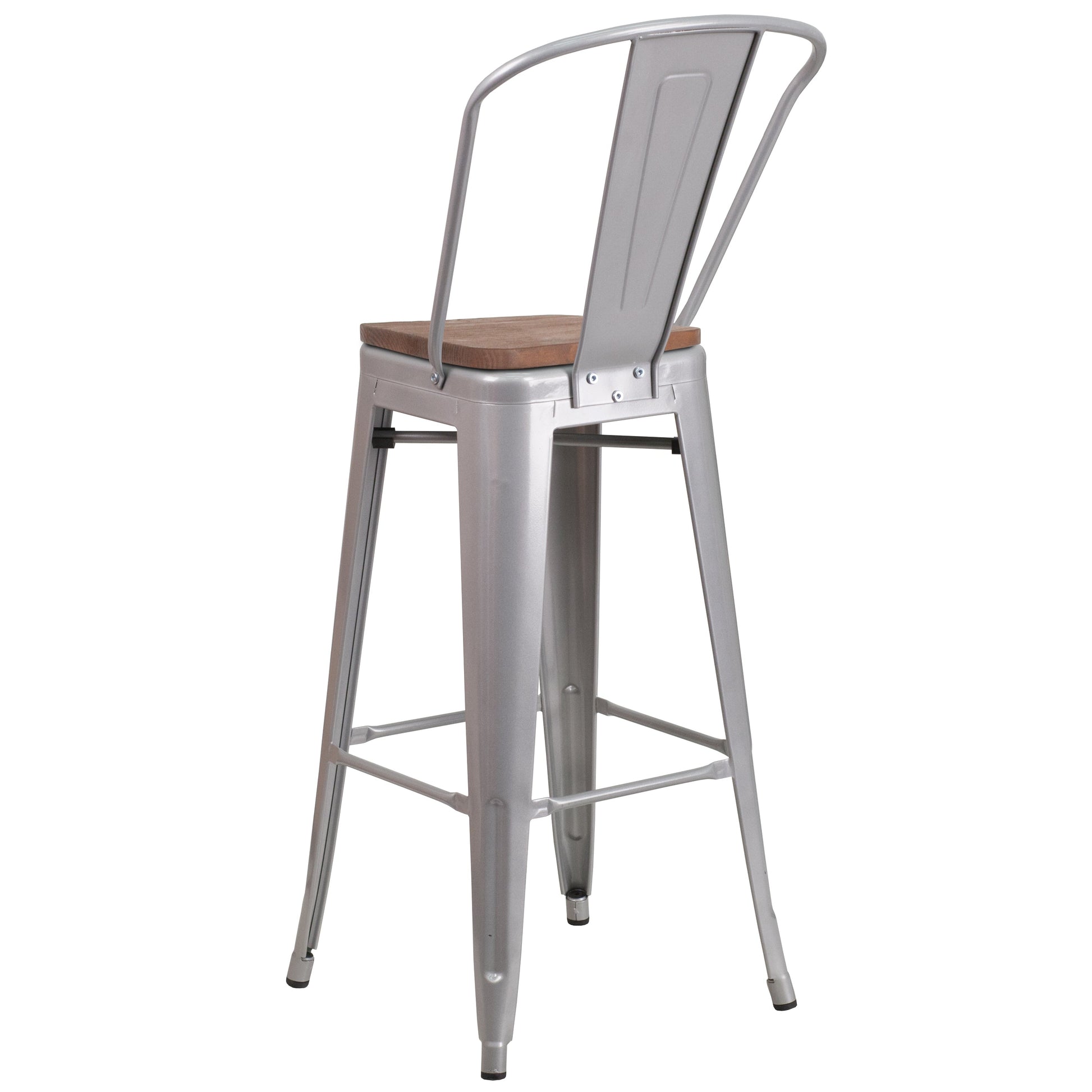 Lily 30" High Silver Metal Barstool with Back and Wood Seat Dimensions: 17.75"W x 20"D x 45.25"H