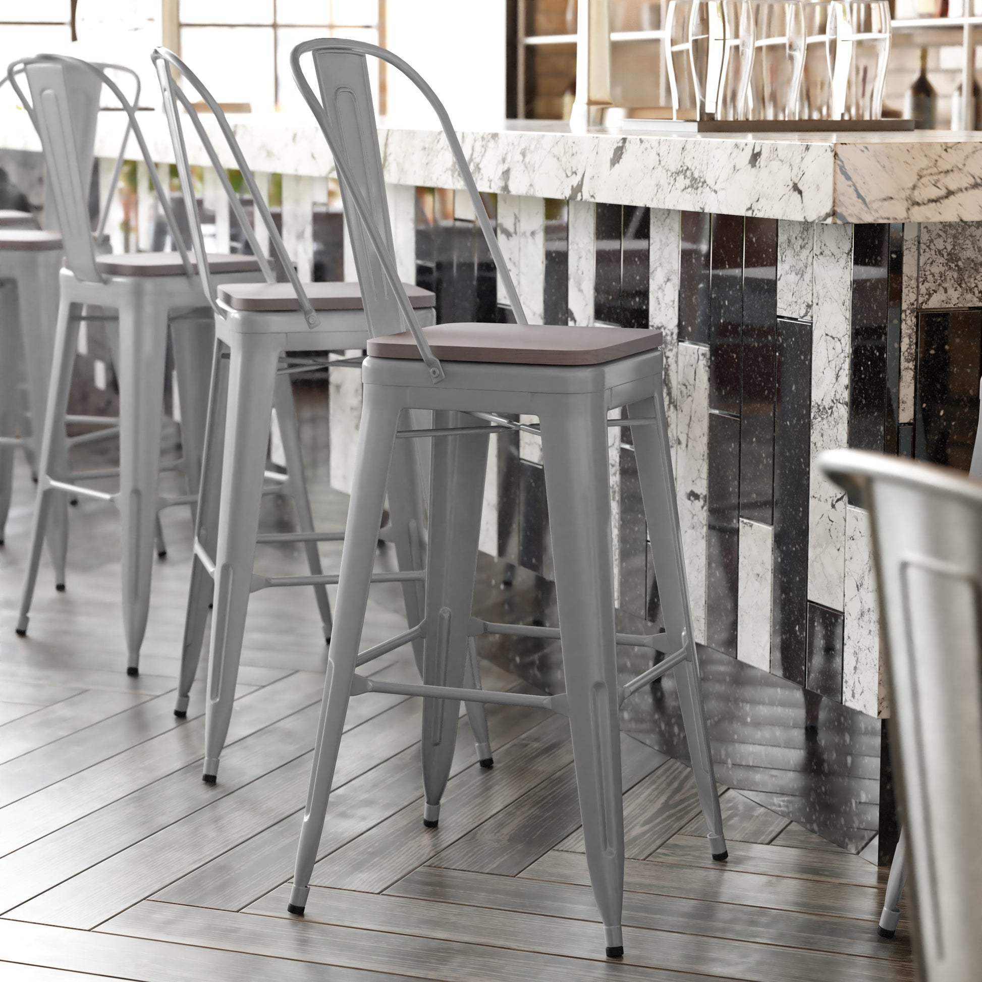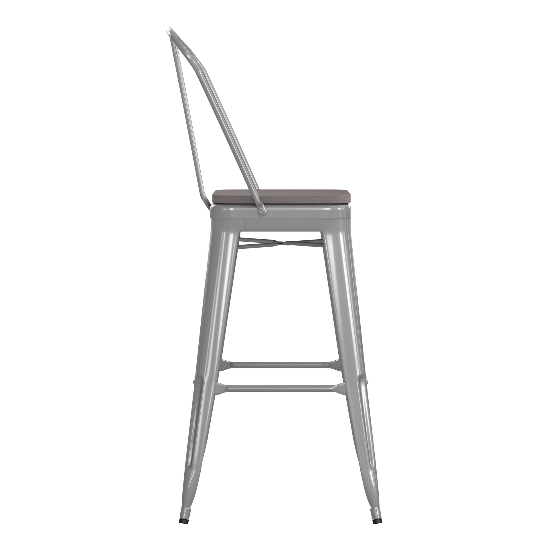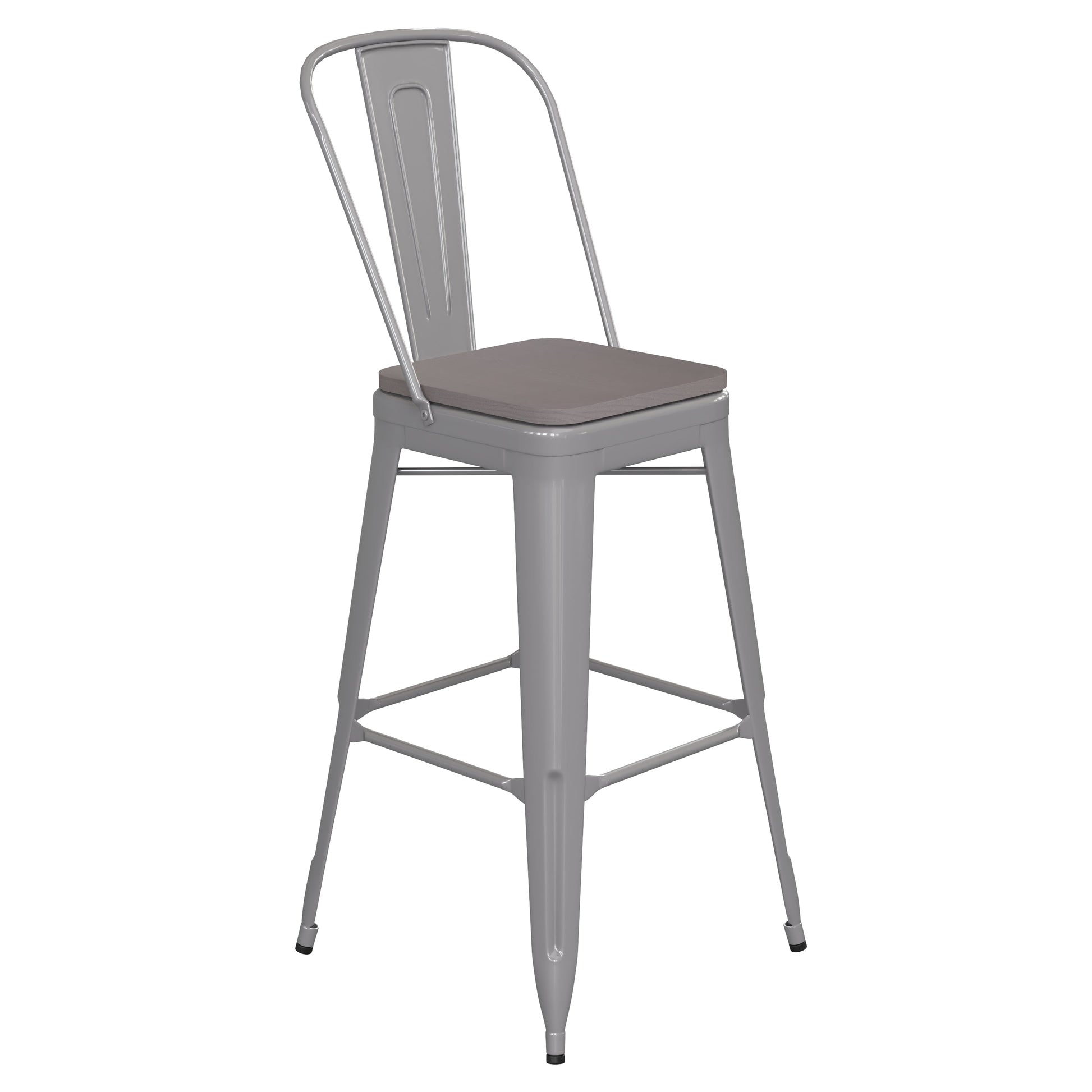 Kai Commercial Grade 30" High Silver Metal Indoor-Outdoor Bar Height Stool with Removable Back and Gray All-Weather Poly Resin Seat Dimensions: 17.75"W x 20"D x 45.25"H
