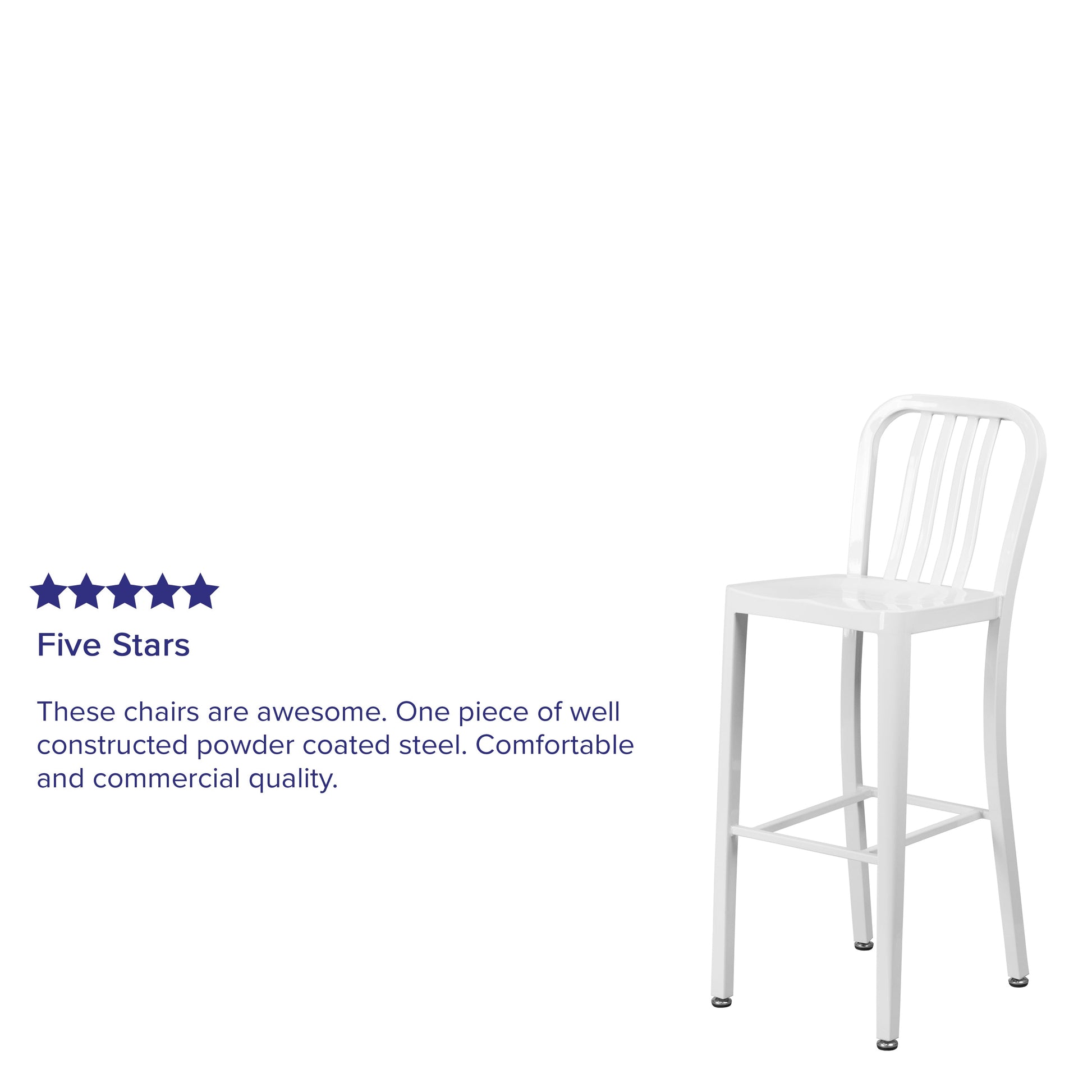 Gael Commercial Grade 30" High White Metal Indoor-Outdoor Barstool with Vertical Slat Back Dimensions: 15.5"W x 20"D x 43"H