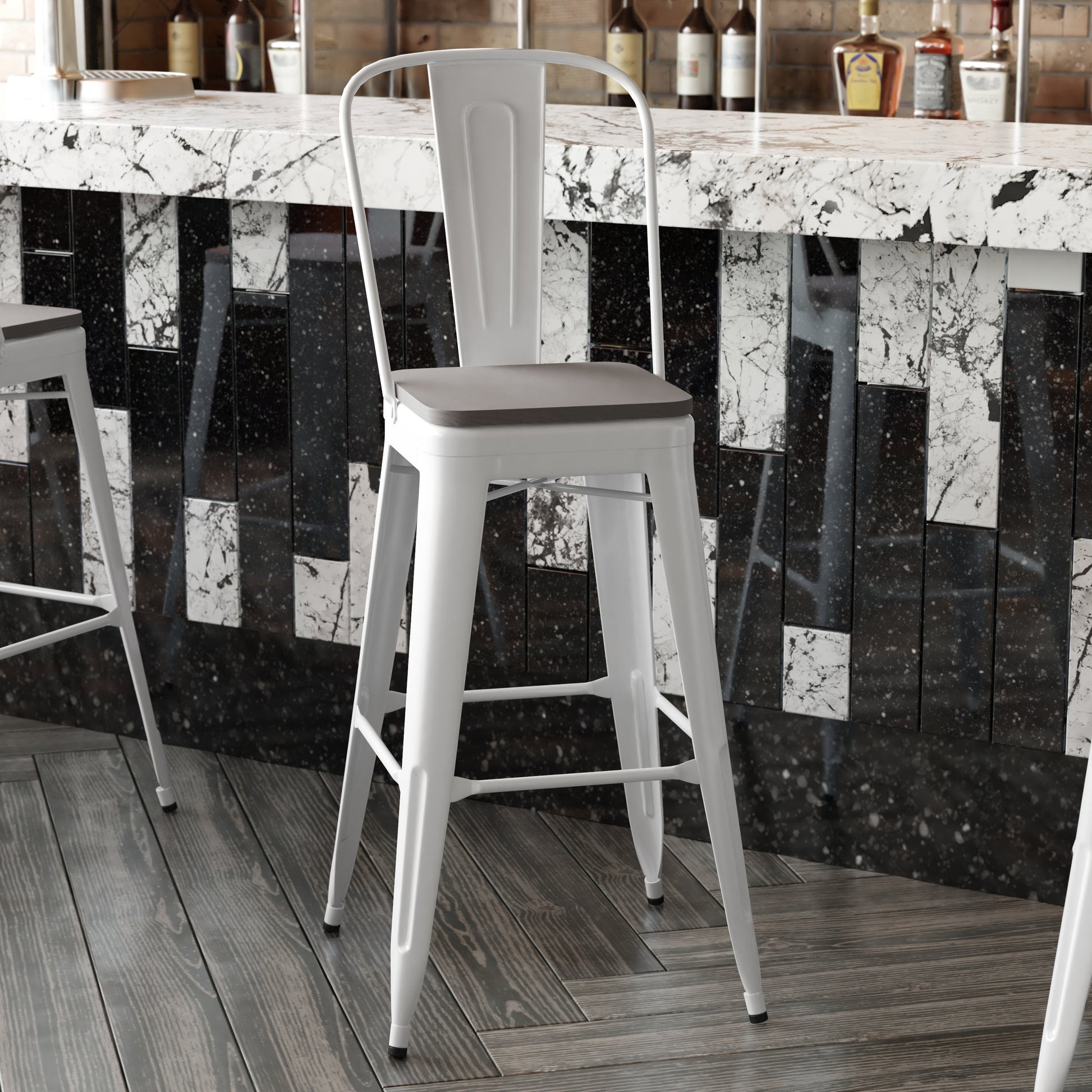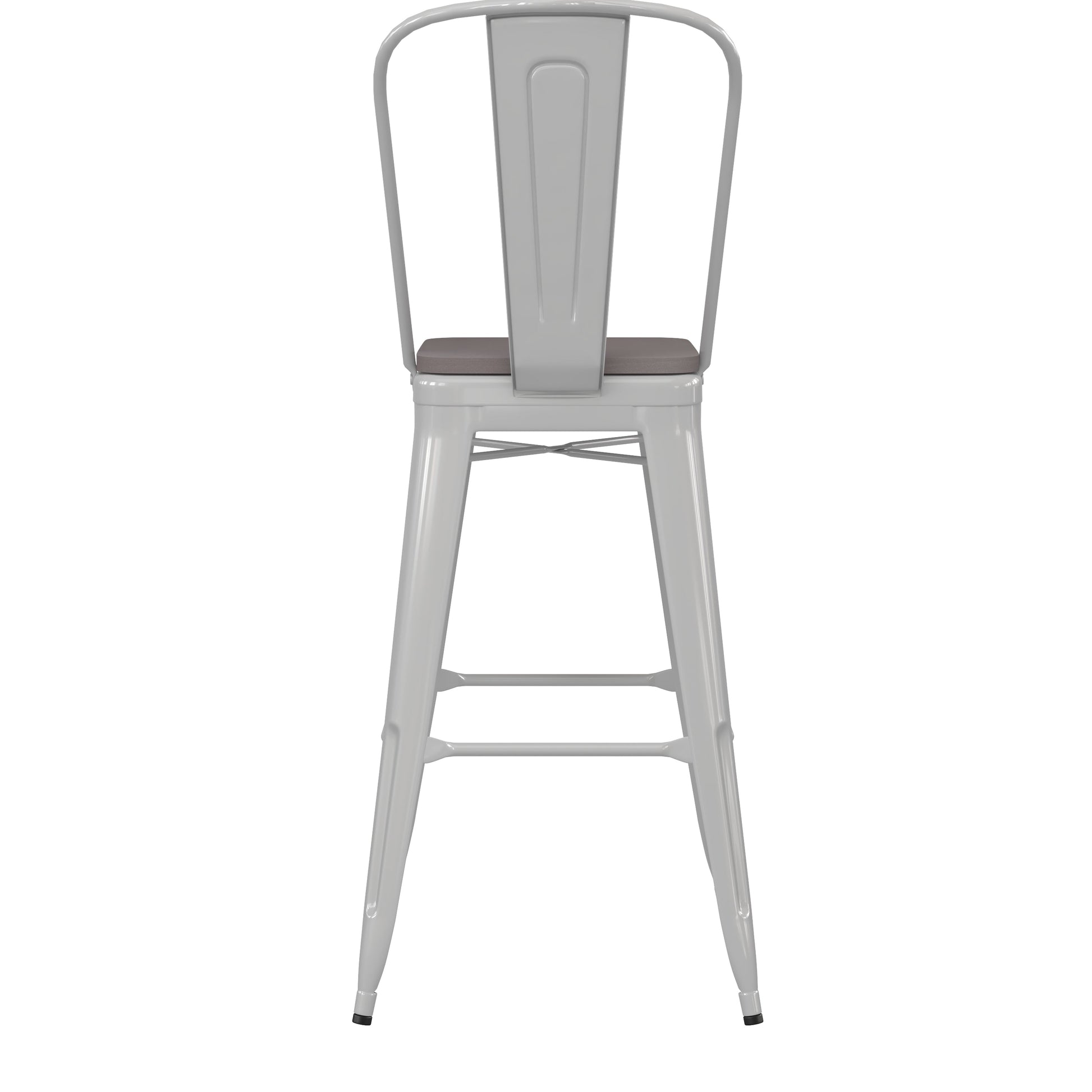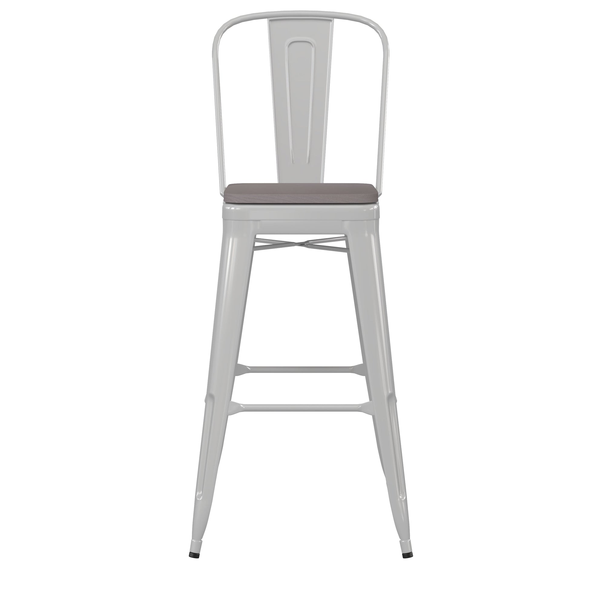 Kai Commercial Grade 30" High White Metal Indoor-Outdoor Bar Height Stool with Removable Back and Gray All-Weather Poly Resin Seat Dimensions: 17.75"W x 20"D x 45.25"H