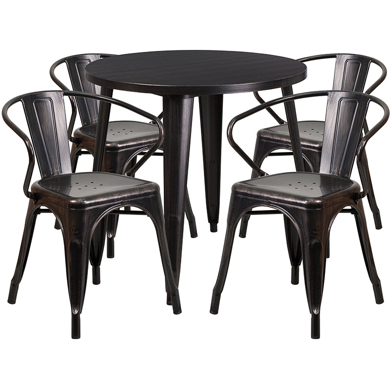 Cory Commercial Grade 30" Round Black-Antique Gold Metal Indoor-Outdoor Table Set with 4 Arm Chairs Dimensions: 30"W x 30"D x 29.5"H