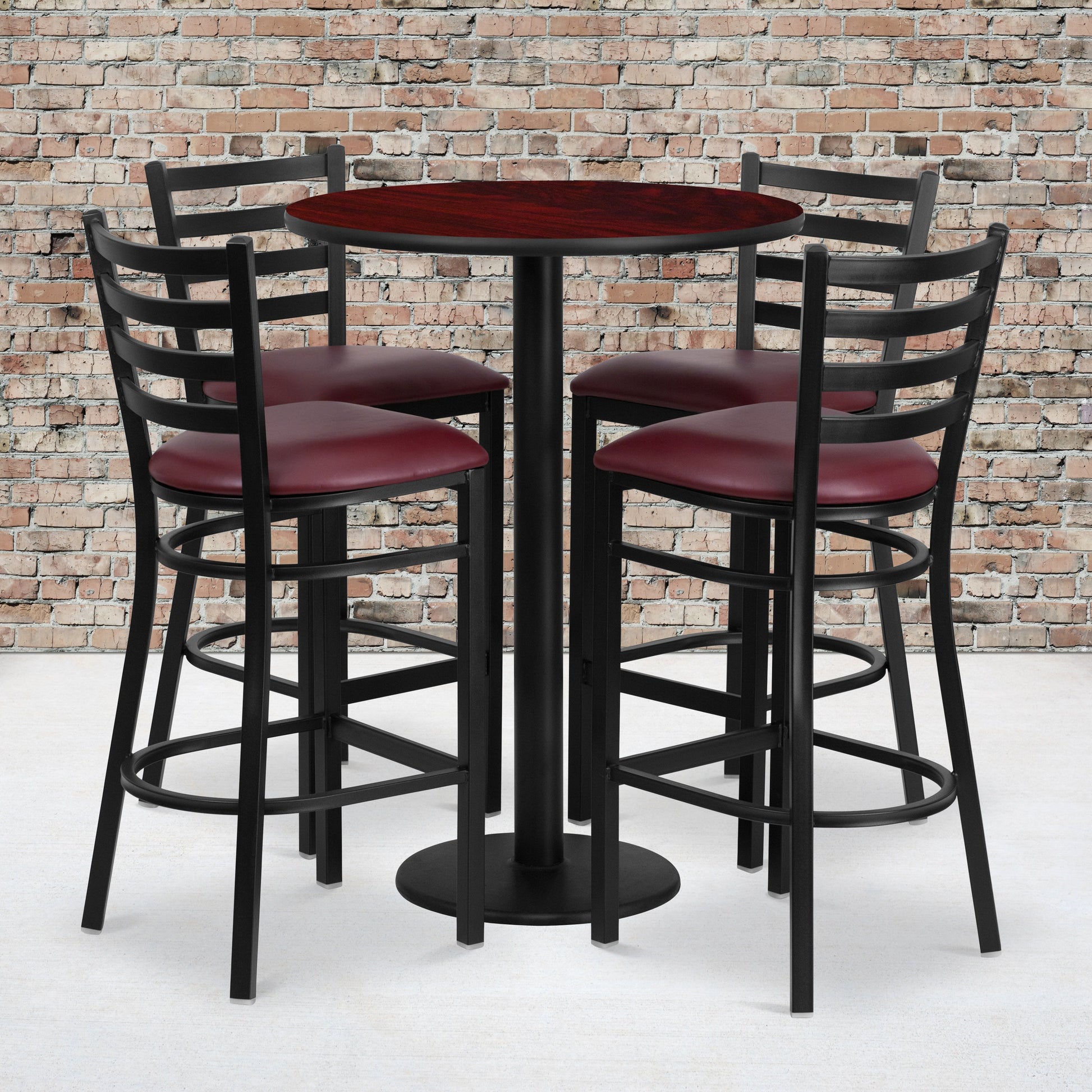 Jamie 30'' Round Mahogany Laminate Table Set with Round Base and 4 Ladder Back Metal Barstools - Burgundy Vinyl Seat Dimensions: 30"W x 30"D x 42"H