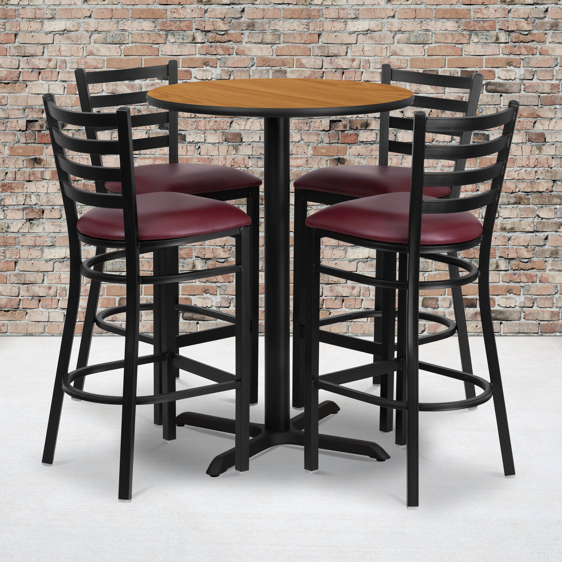 Carlton 30'' Round Natural Laminate Table Set with X-Base and 4 Ladder Back Metal Barstools - Burgundy Vinyl Seat Dimensions: 30"W x 30"D x 42"H