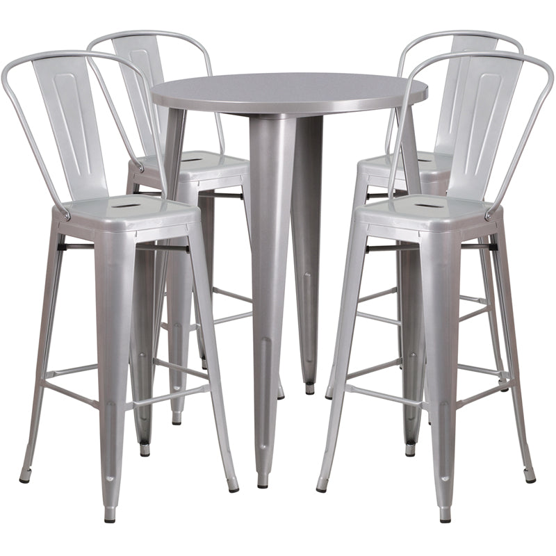 Callum Commercial Grade 30" Round Silver Metal Indoor-Outdoor Bar Table Set with 4 Cafe Stools Dimensions: 30"W x 30"D x 41"H