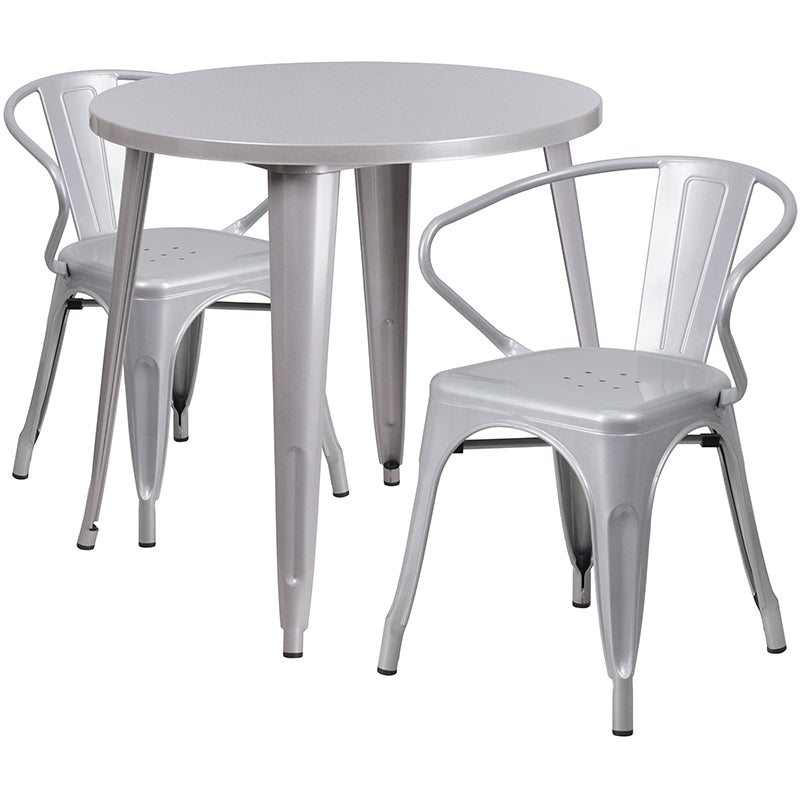 Conrad Commercial Grade 30" Round Silver Metal Indoor-Outdoor Table Set with 2 Arm Chairs Dimensions: 30"W x 30"D x 29.5"H