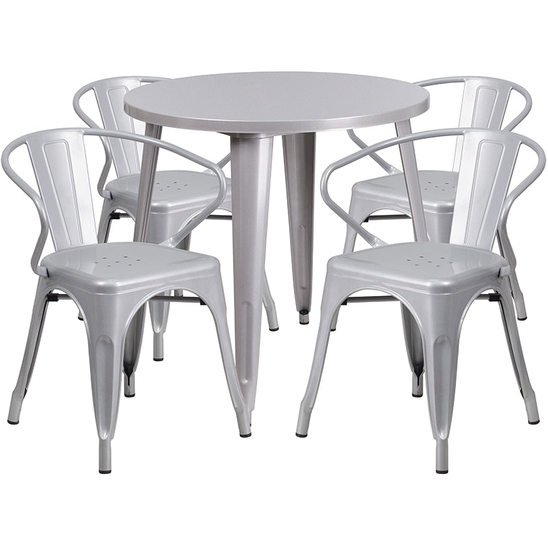 Cory Commercial Grade 30" Round Silver Metal Indoor-Outdoor Table Set with 4 Arm Chairs Dimensions: 30"W x 30"D x 29.5"H