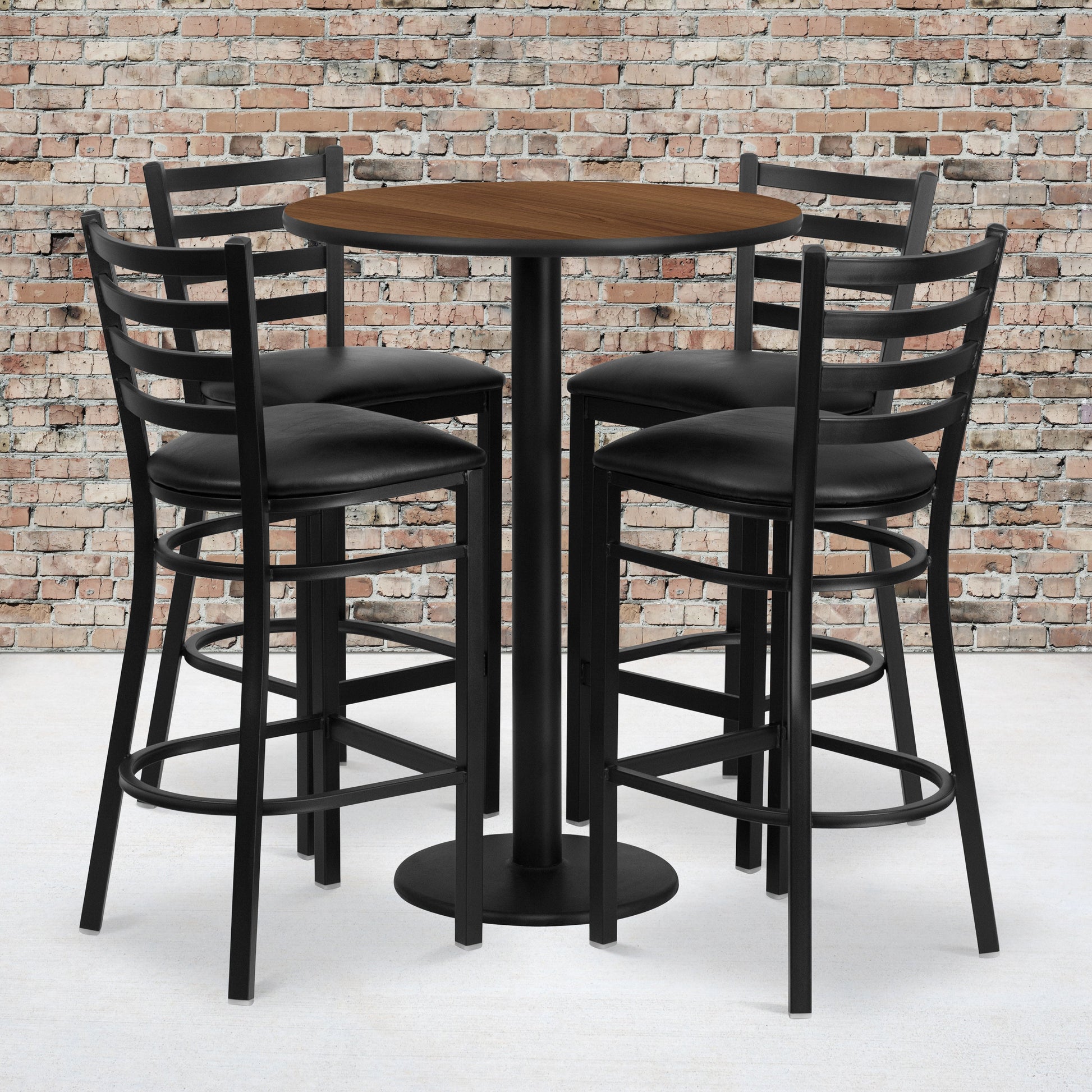 Jamie 30'' Round Walnut Laminate Table Set with Round Base and 4 Ladder Back Metal Barstools - Black Vinyl Seat Dimensions: 30"W x 30"D x 42"H