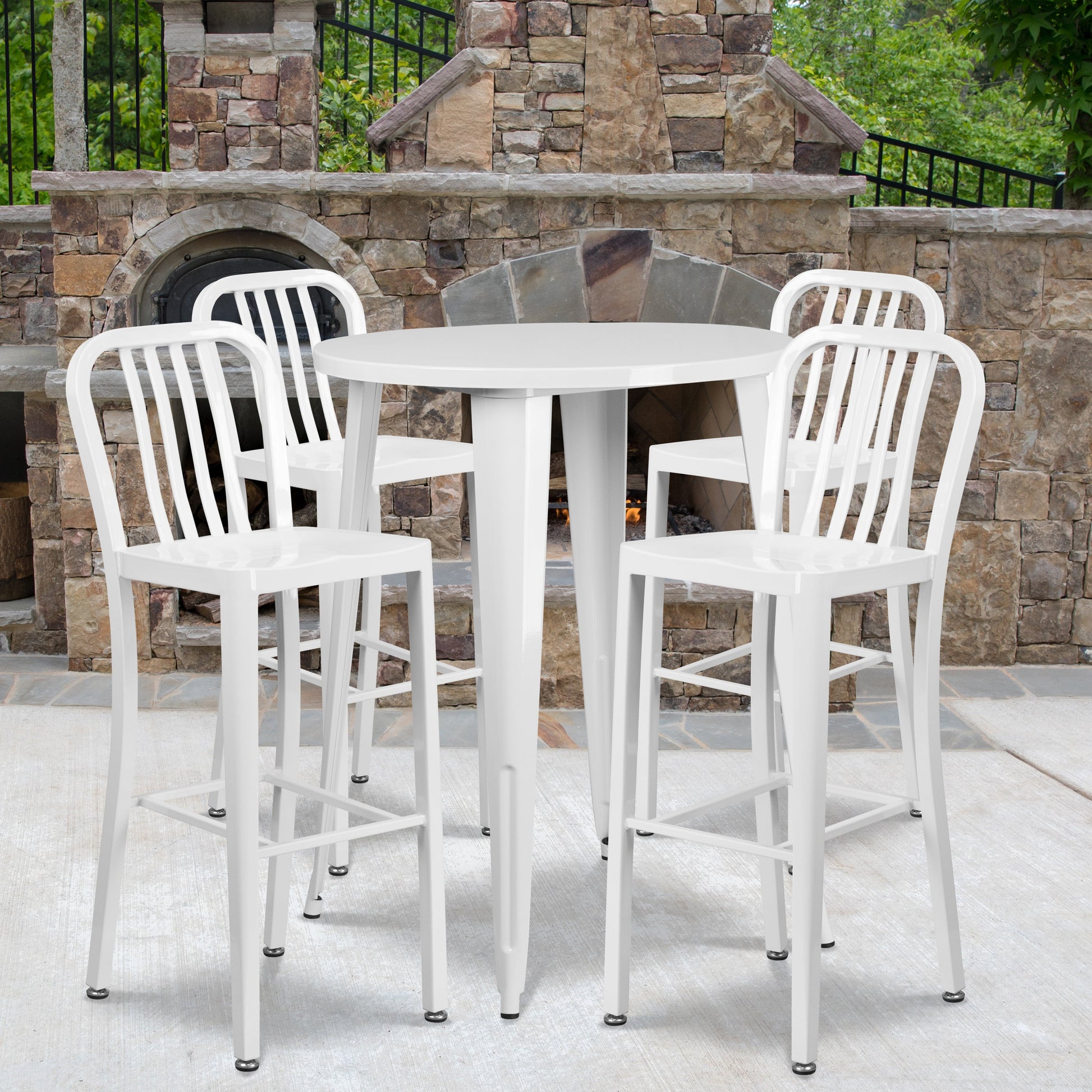 Tristan Commercial Grade 30" Round White Metal Indoor-Outdoor Bar Table Set with 4 Vertical Slat Back Stools Dimensions: 30"W x 30"D x 41"H