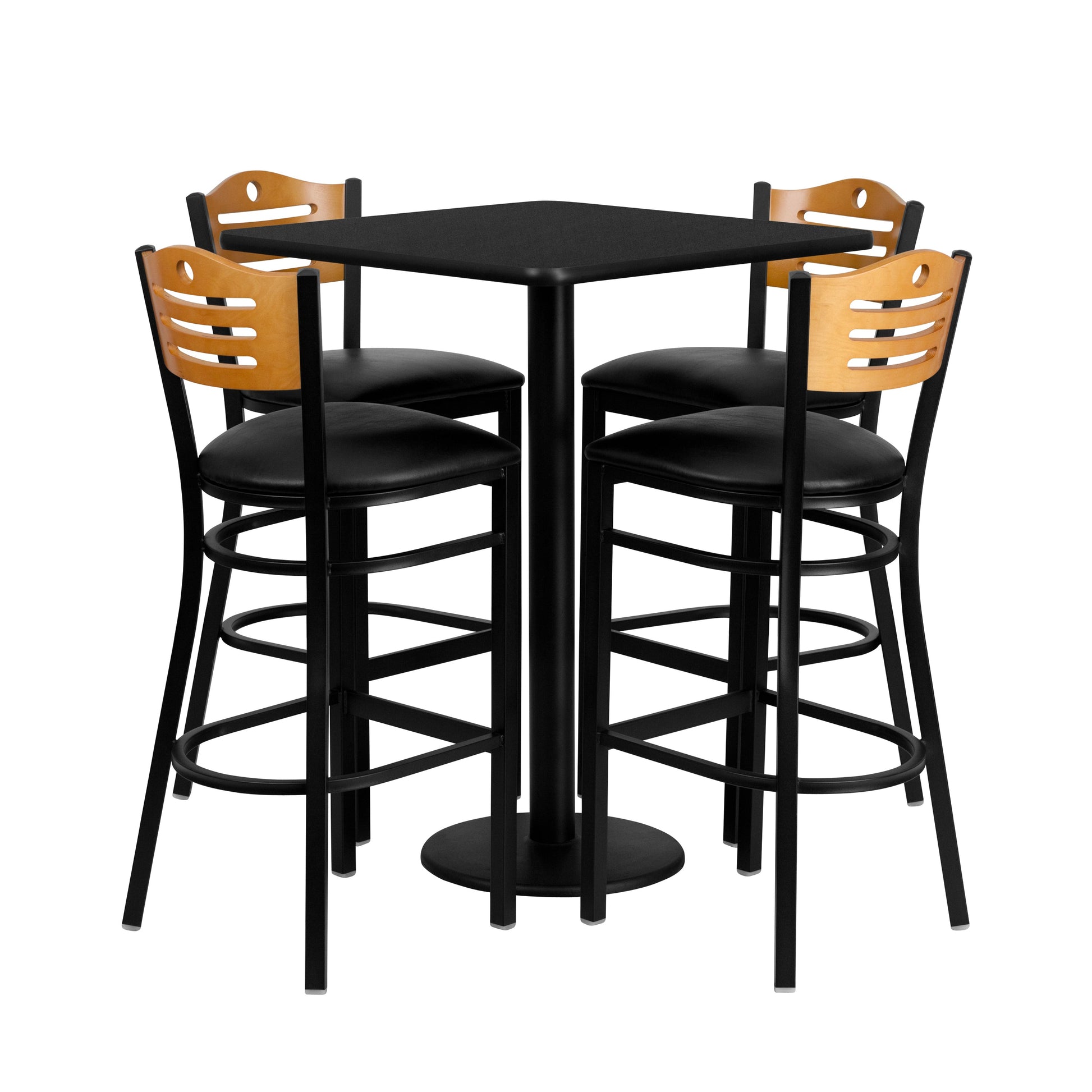 Clark 30'' Square Black Laminate Table Set with 4 Wood Slat Back Metal Barstools - Black Vinyl Seat Dimensions: 30"W x 30"D x 42"H