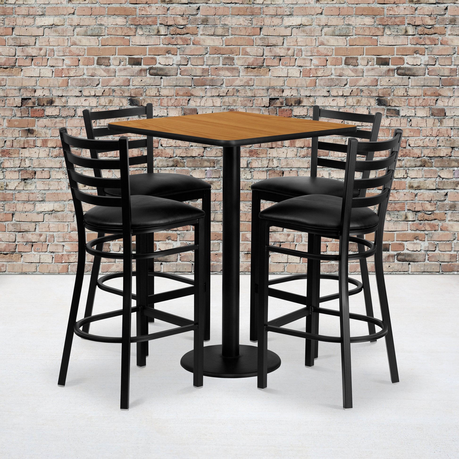 Clark 30'' Square Natural Laminate Table Set with 4 Ladder Back Metal Barstools - Black Vinyl Seat Dimensions: 30"W x 30"D x 42"H
