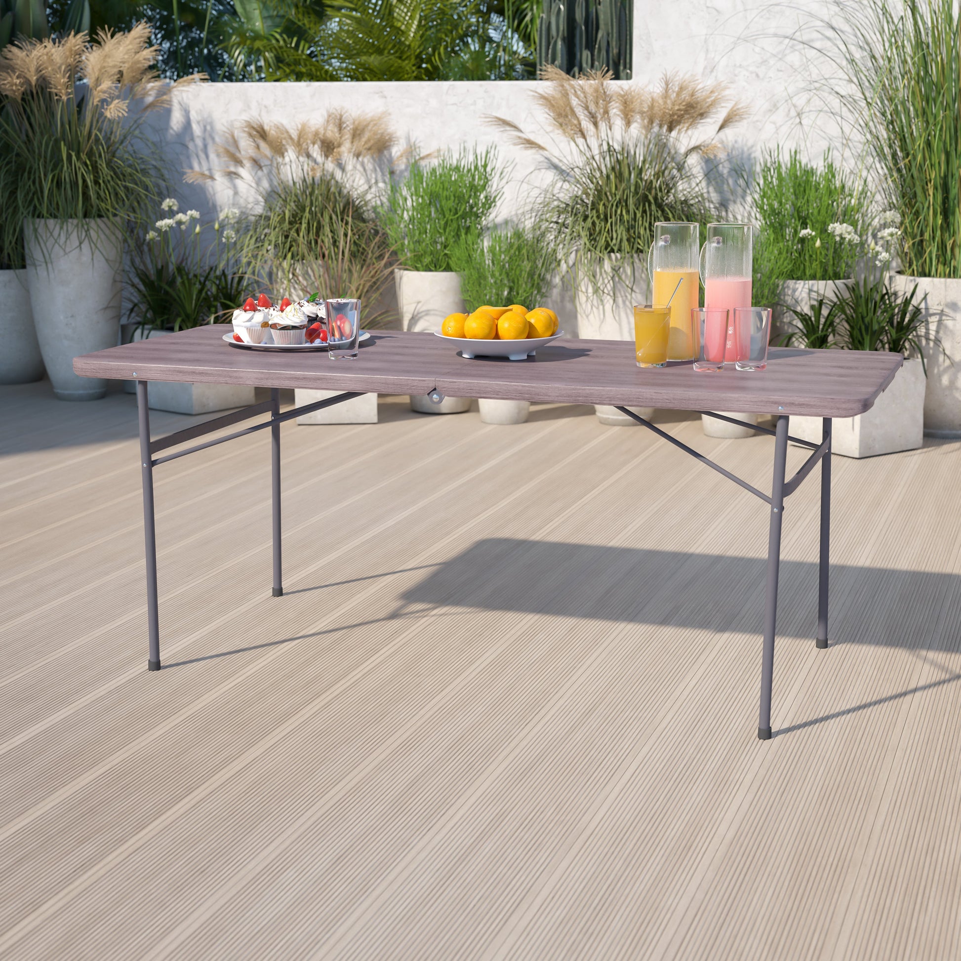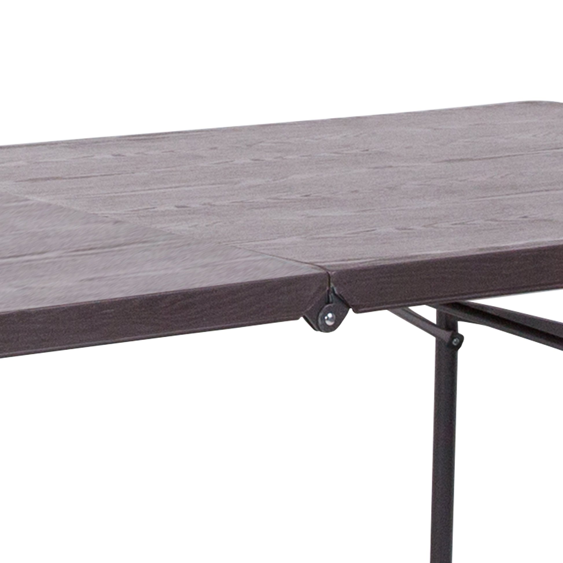 Elijah 6-Foot Bi-Fold Brown Wood Grain Plastic Folding Table with Carrying Handle Dimensions: 30"W x 72"D x 29"H