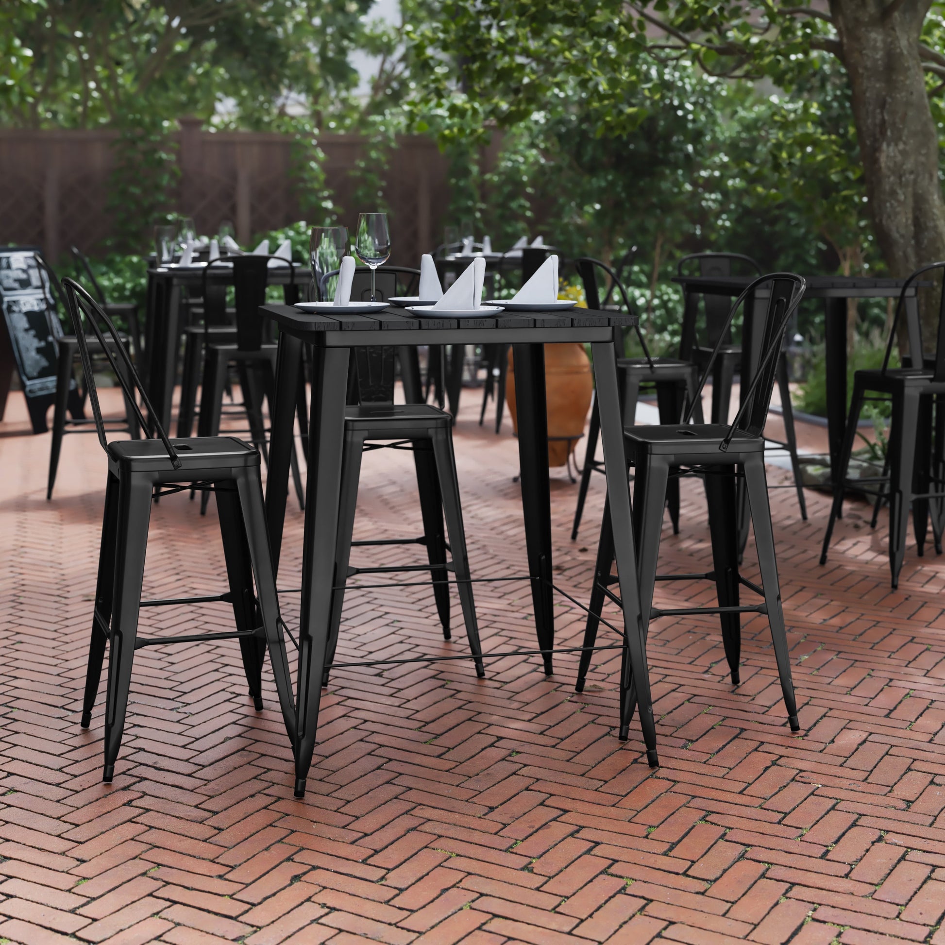 Declan Commercial Indoor/Outdoor Bar Top Table, 31.5" Square All Weather Black Poly Resin Top with Black Steel base Dimensions: 31.5"W x 31.5"D x 42"H