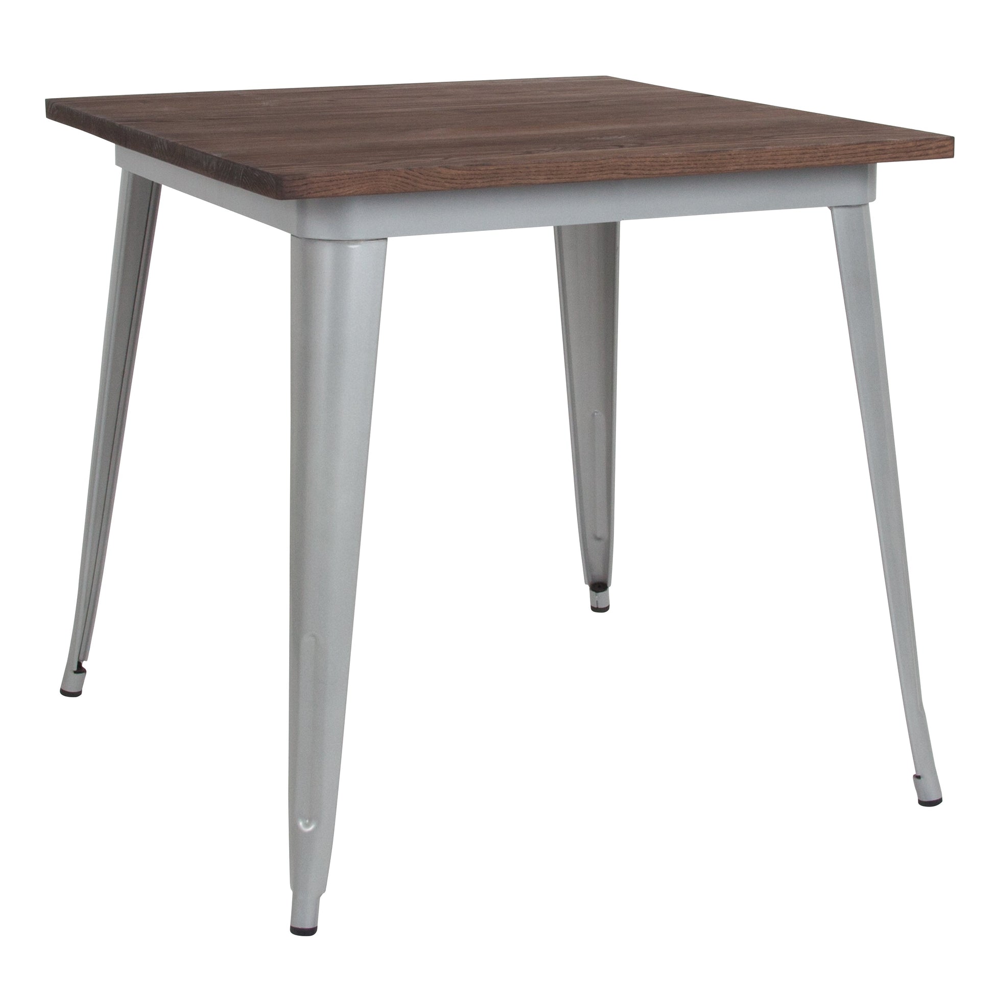 Toby 31.5" Square Silver Metal Indoor Table with Walnut Rustic Wood Top Dimensions: 31.5"W x 31.5"D x 30.5"H