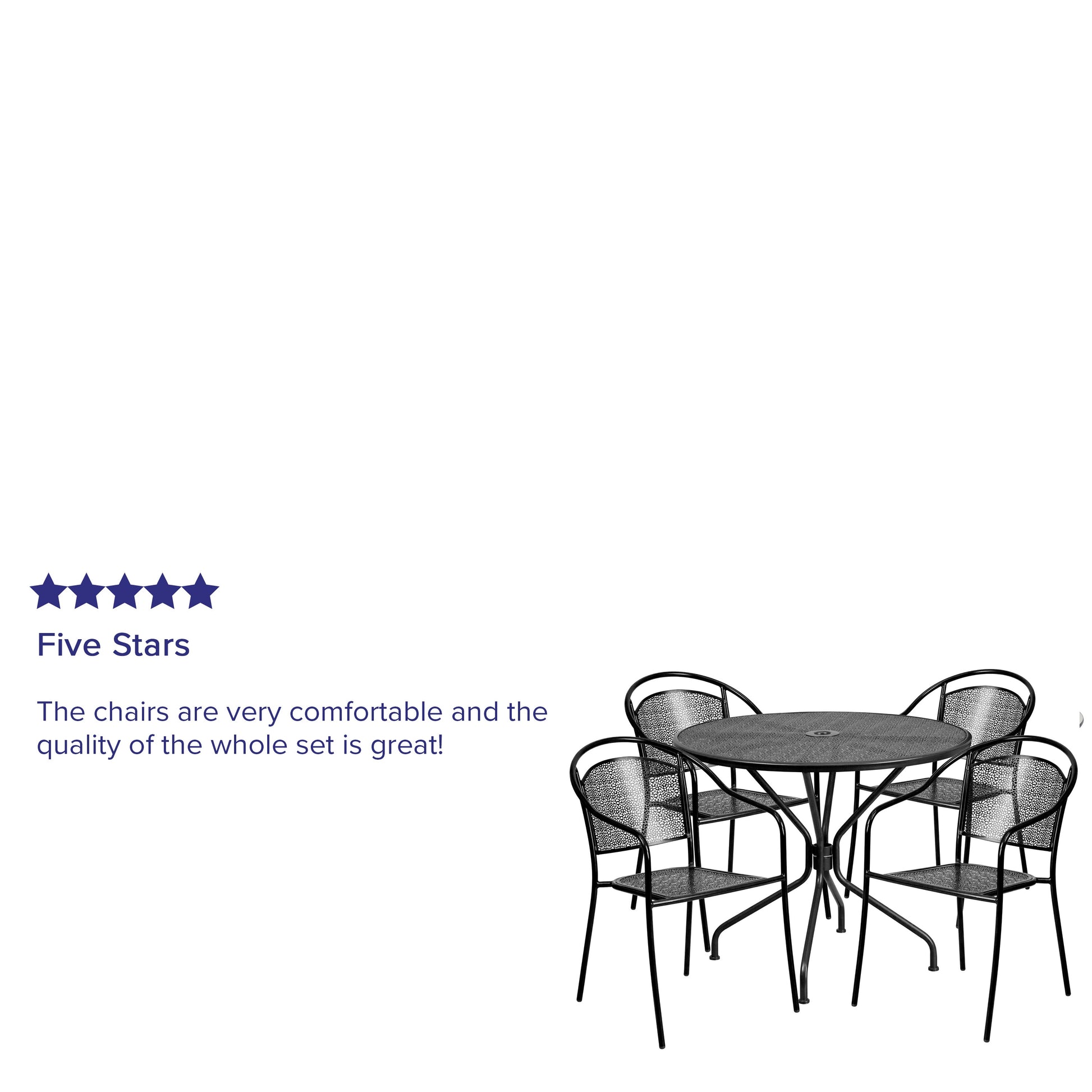 Oia Commercial Grade 35.25" Round Black Indoor-Outdoor Steel Patio Table Set with 4 Round Back Chairs Dimensions: 35.25"W x 35.25"D x 28.75"H