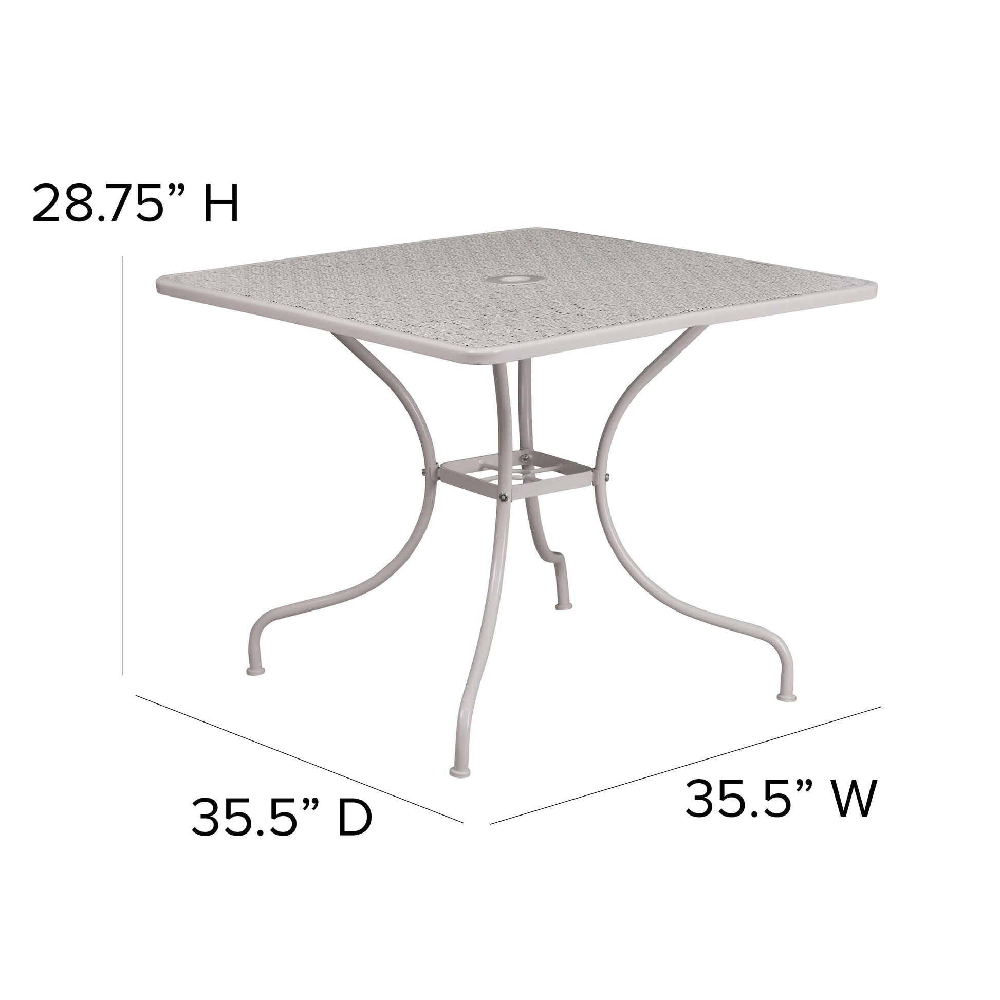 Oia Commercial Grade 35.5" Square Light Gray Indoor-Outdoor Steel Patio Table with Umbrella Hole Dimensions: 35.5"W x 35.5"D x 28.75"H