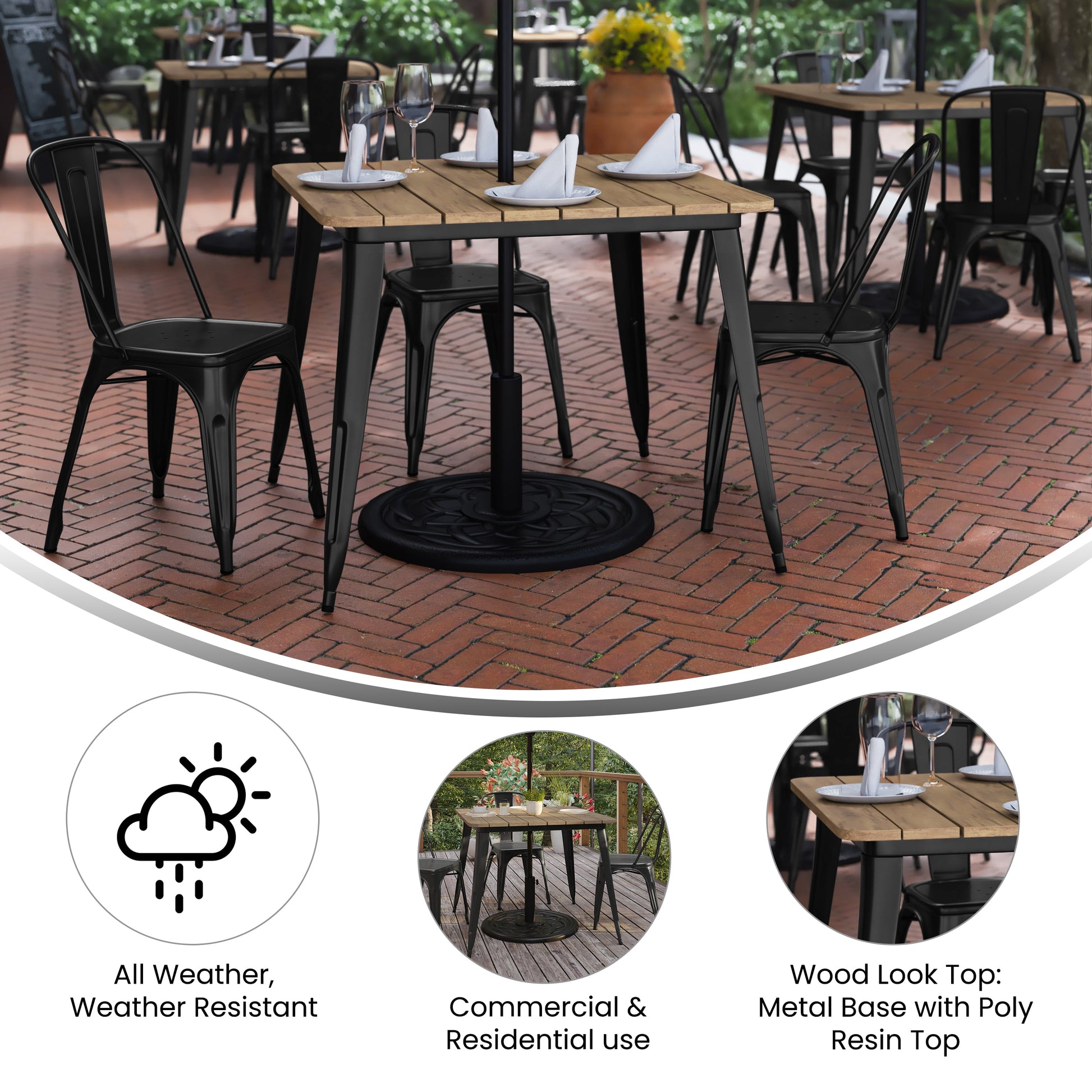 Declan Commercial Indoor/Outdoor Dining Table with Umbrella Hole, 36" Square All Weather Brown Poly Resin Top and Black Steel Base Dimensions: 36"W x 36"D x 30"H