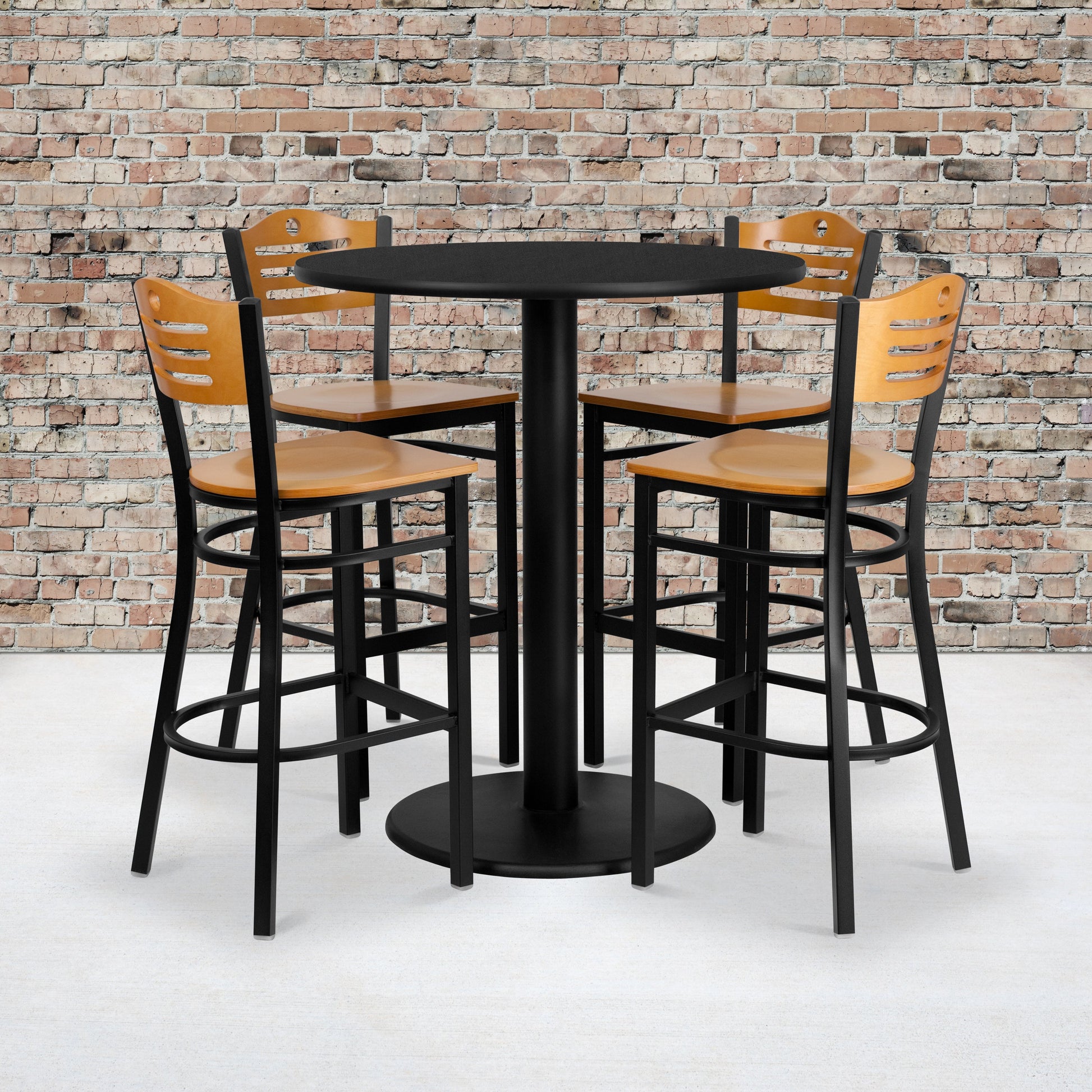Clark 36'' Round Black Laminate Table Set with 4 Wood Slat Back Metal Barstools - Natural Wood Seat Dimensions: 36"W x 36"D x 42"H