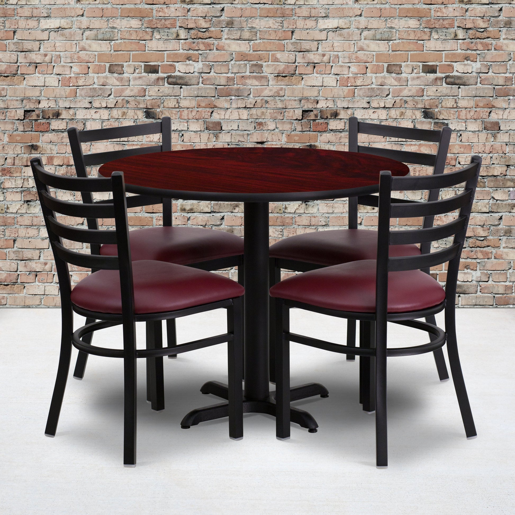Carlton 36'' Round Mahogany Laminate Table Set with X-Base and 4 Ladder Back Metal Chairs - Burgundy Vinyl Seat Dimensions: 36"W x 36"D x 30"H