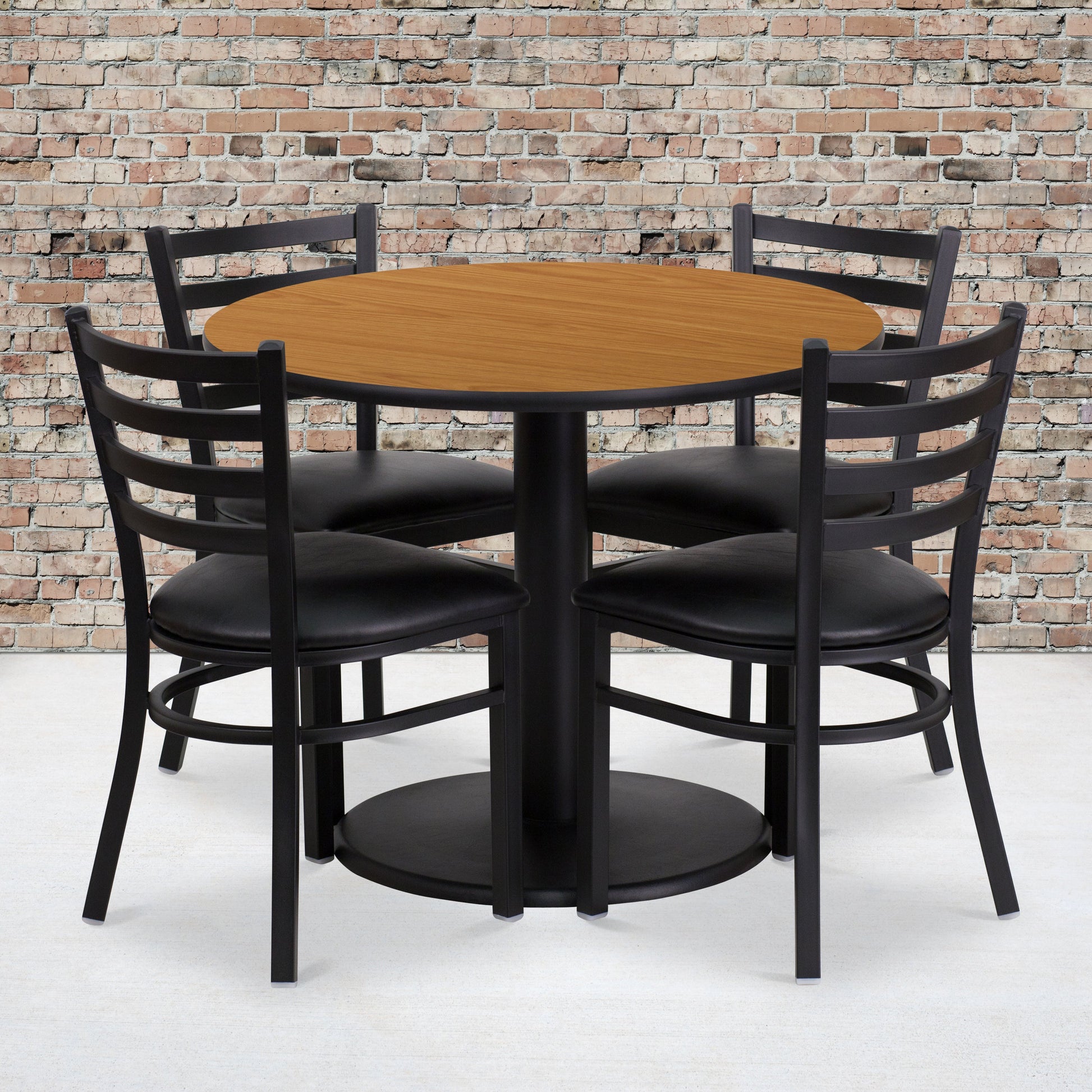 Jamie 36'' Round Natural Laminate Table Set with Round Base and 4 Ladder Back Metal Chairs - Black Vinyl Seat Dimensions: 36"W x 36"D x 30"H