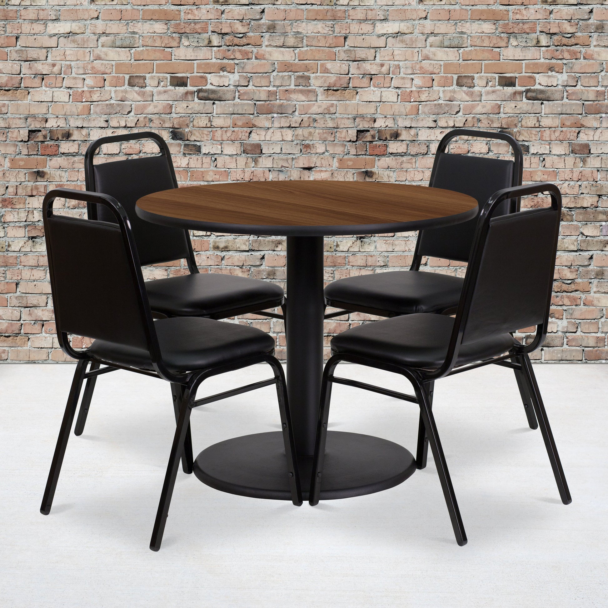 Jamie 36'' Round Walnut Laminate Table Set with Round Base and 4 Black Trapezoidal Back Banquet Chairs Dimensions: 36"W x 36"D x 30"H