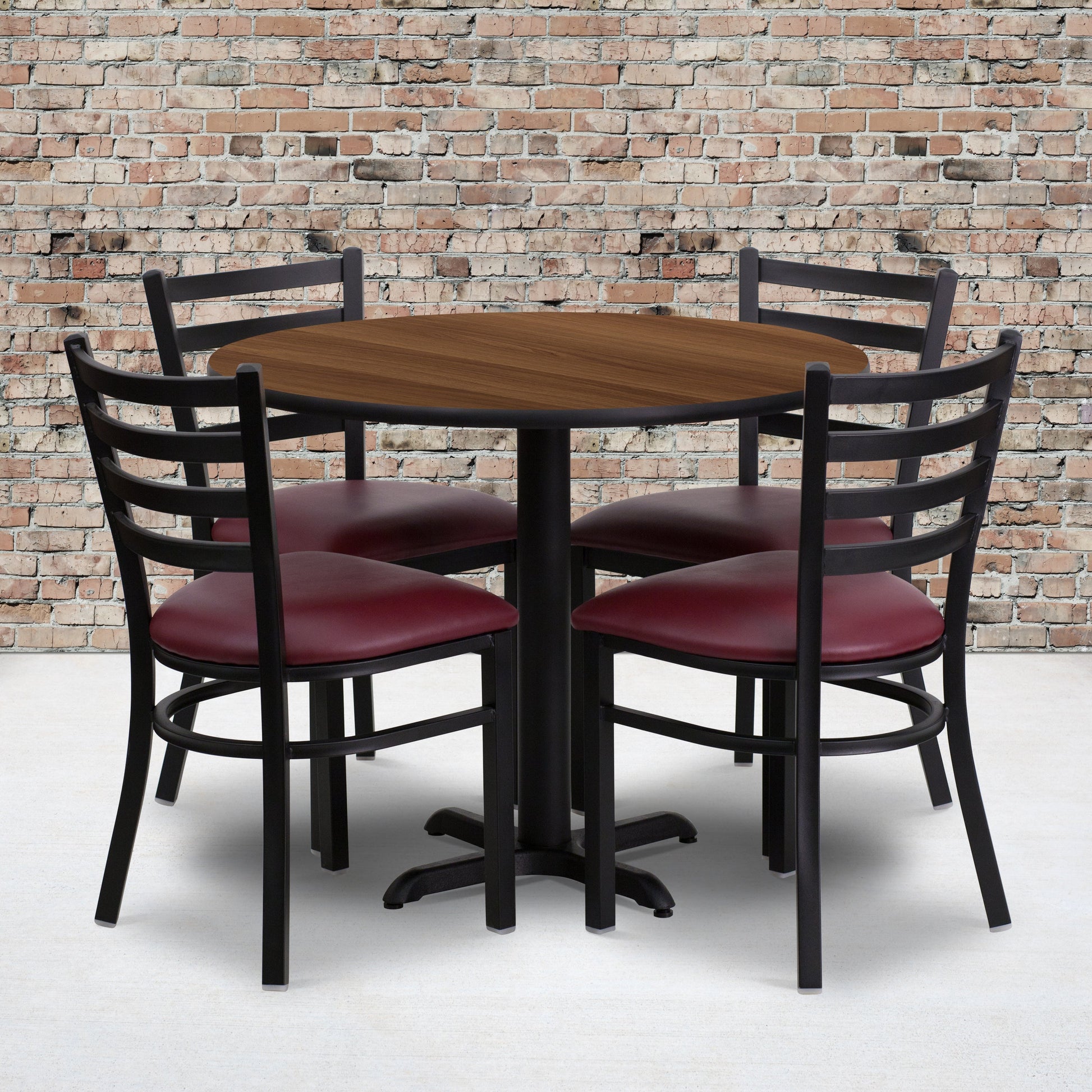 Carlton 36'' Round Walnut Laminate Table Set with X-Base and 4 Ladder Back Metal Chairs - Burgundy Vinyl Seat Dimensions: 36"W x 36"D x 30"H