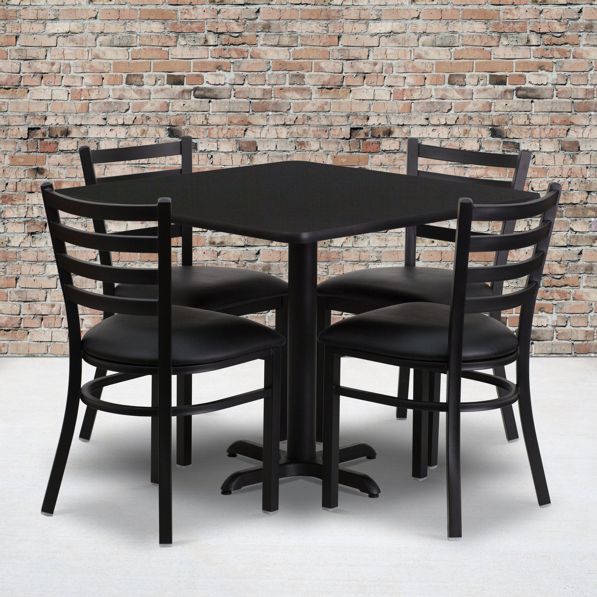 Carlton 36'' Square Black Laminate Table Set with X-Base and 4 Ladder Back Metal Chairs - Black Vinyl Seat Dimensions: 36"W x 36"D x 30"H