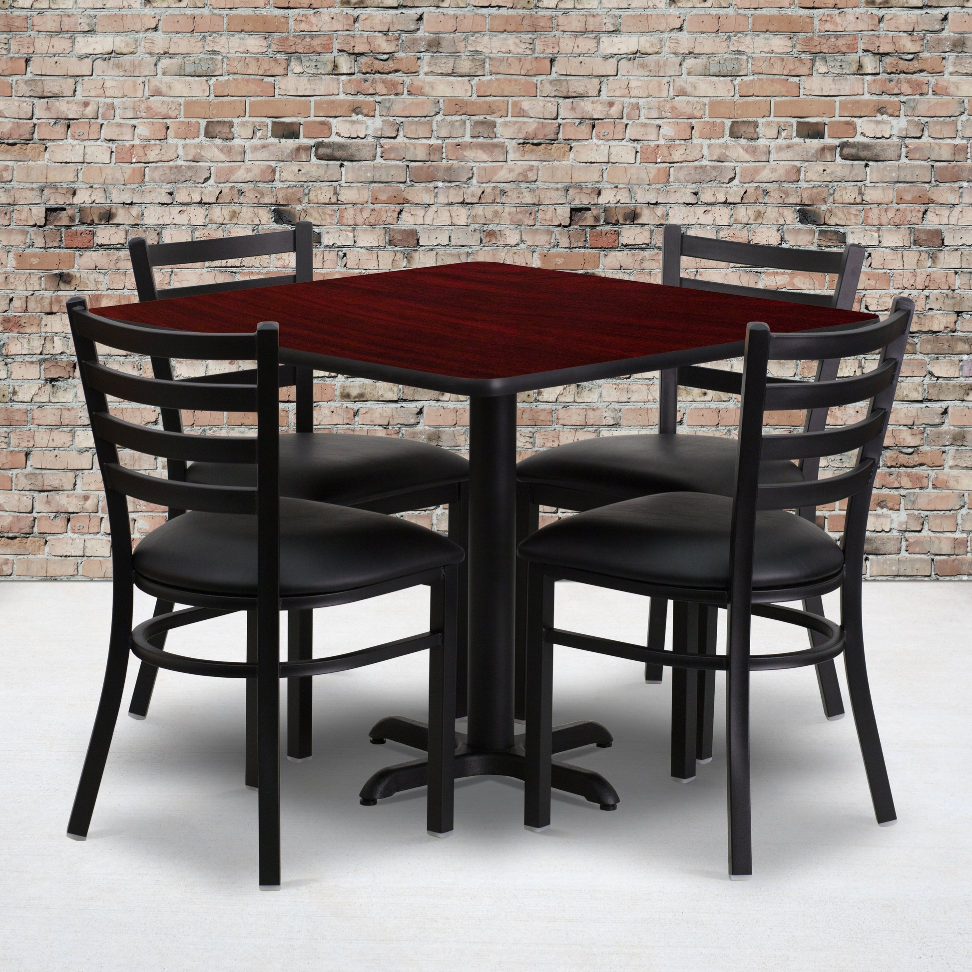 Carlton 36'' Square Mahogany Laminate Table Set with X-Base and 4 Ladder Back Metal Chairs - Black Vinyl Seat Dimensions: 36"W x 36"D x 30"H