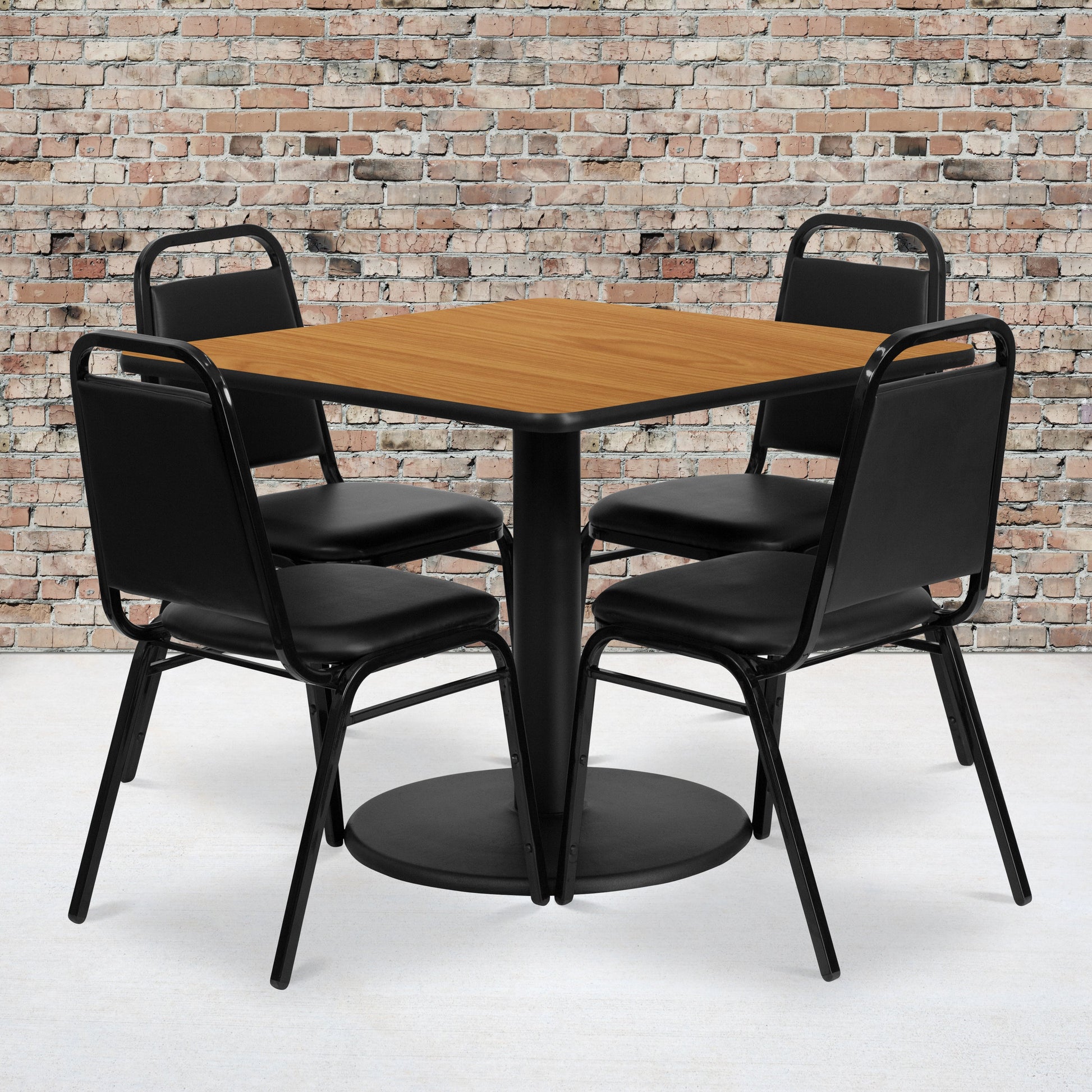 Jamie 36'' Square Natural Laminate Table Set with Round Base and 4 Black Trapezoidal Back Banquet Chairs Dimensions: 36"W x 36"D x 30"H