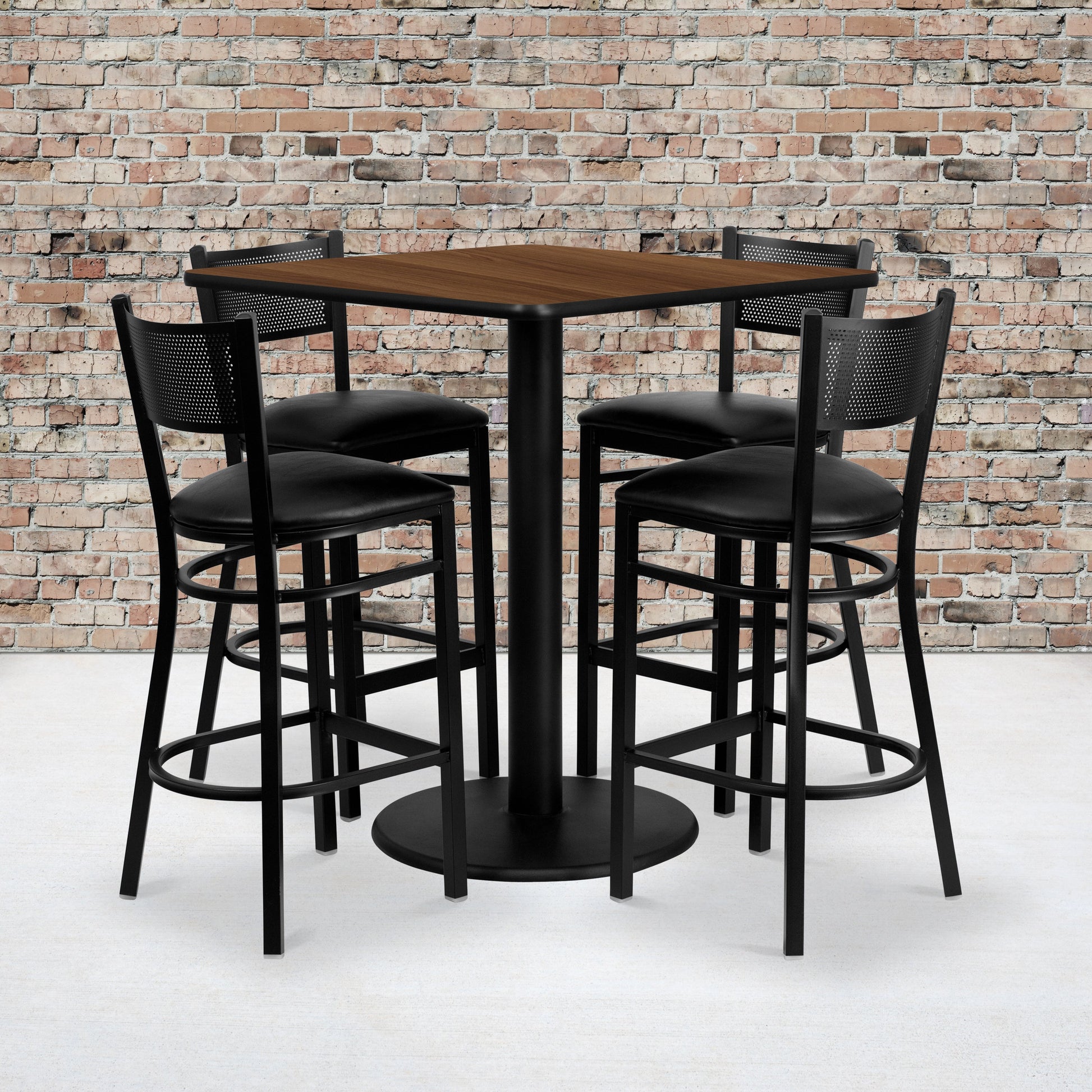 Clark 36'' Square Walnut Laminate Table Set with 4 Grid Back Metal Barstools - Black Vinyl Seat Dimensions: 36"W x 36"D x 42"H