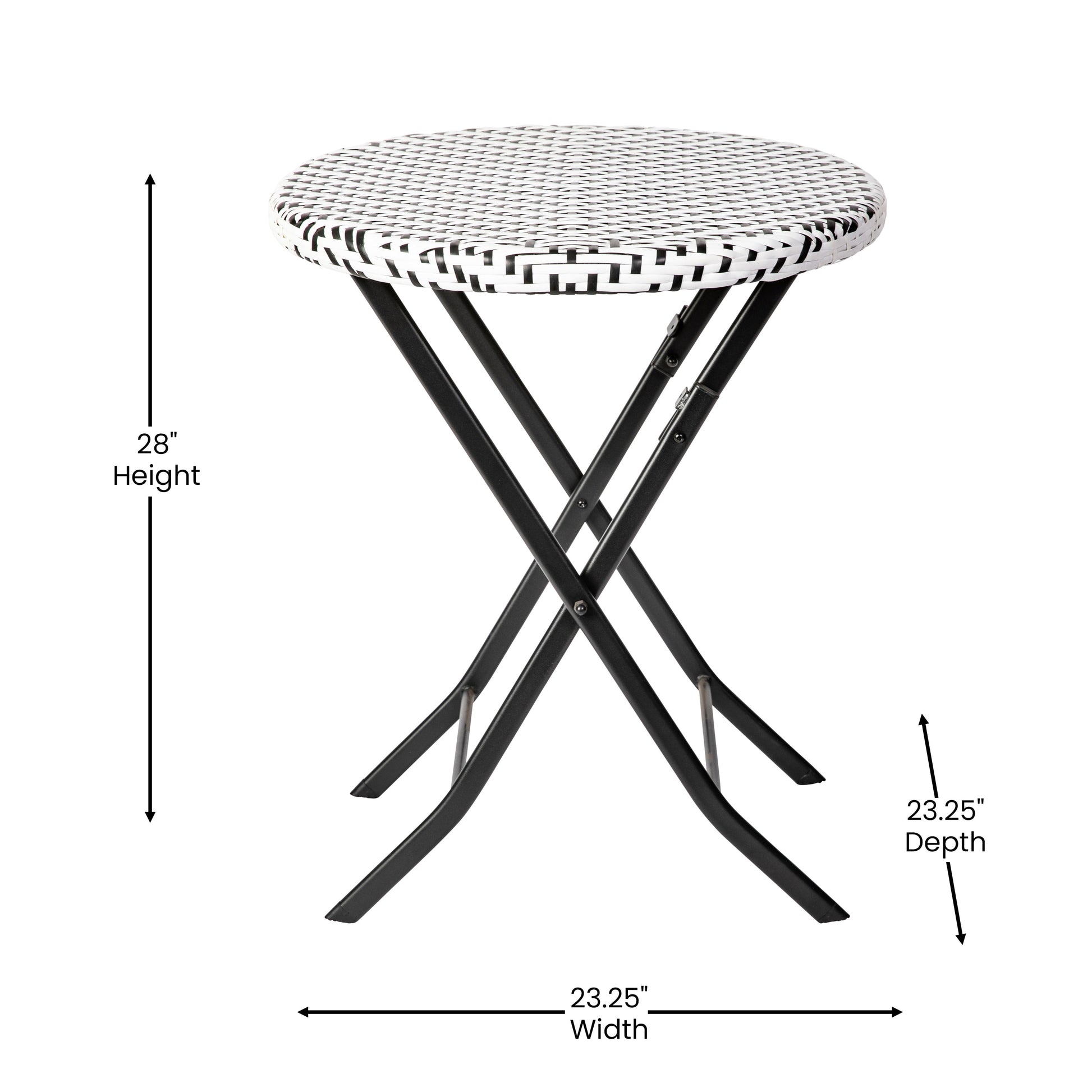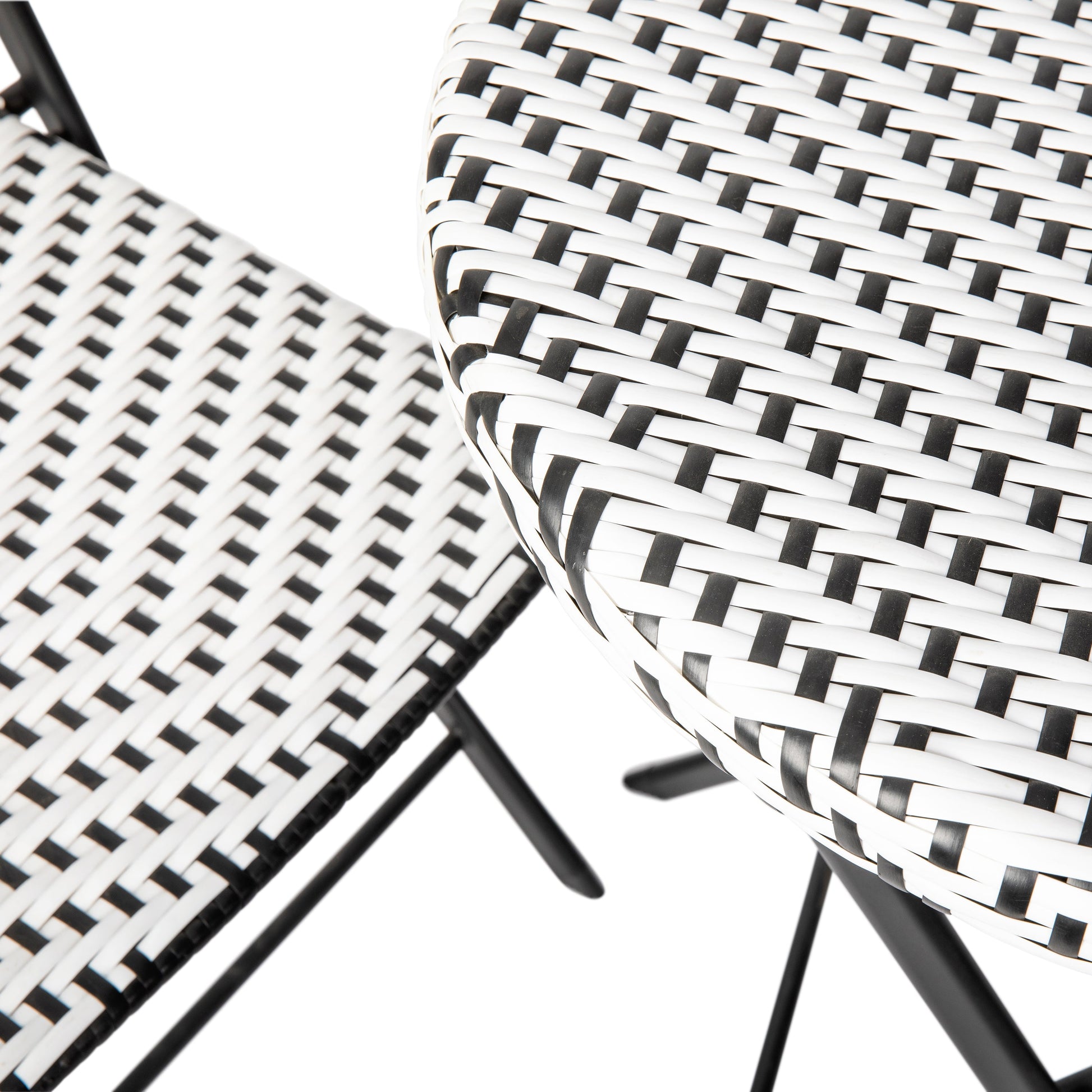 Rouen Three Piece Commercial Grade Foldable French Bistro Set, Indoor/Outdoor PE Rattan Back, Seat and Table Top, Black/White with Black Steel Frames Dimensions: 17.75"W x 21.75"D x 32"H