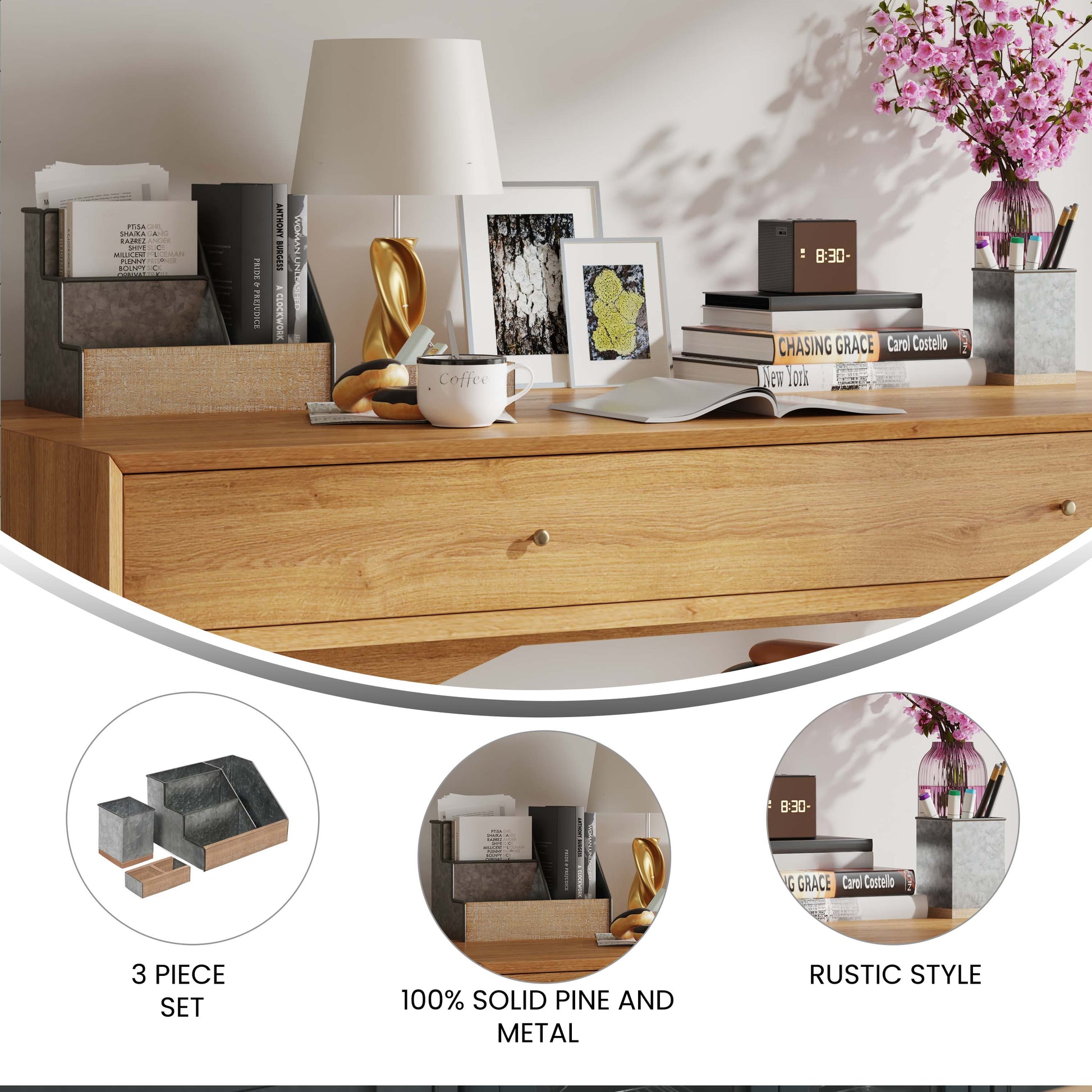Comerford 3 Piece Galvanized Finish Metal and Rustic Wood Organizer Set For Desktop, Countertop, or Vanity Dimensions: 9.75"W x 6"D x 7.25"H