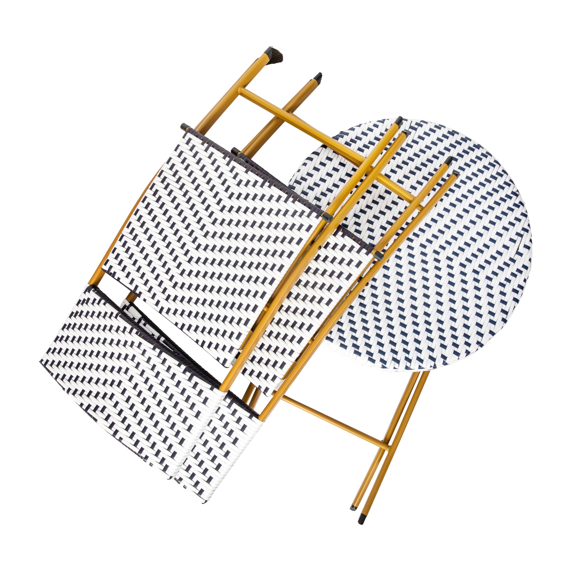 Rouen Three Piece Commercial Grade Foldable French Bistro Set, Indoor/Outdoor PE Rattan Back, Seat and Table Top, Navy/White with Natural Steel Frames Dimensions: 17.75"W x 21.75"D x 32"H