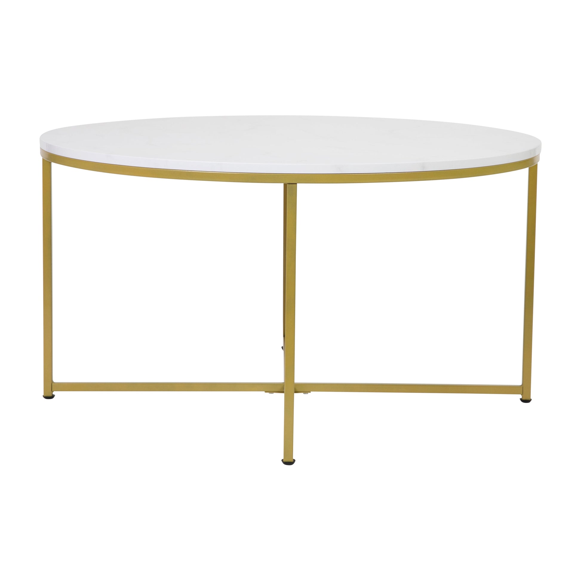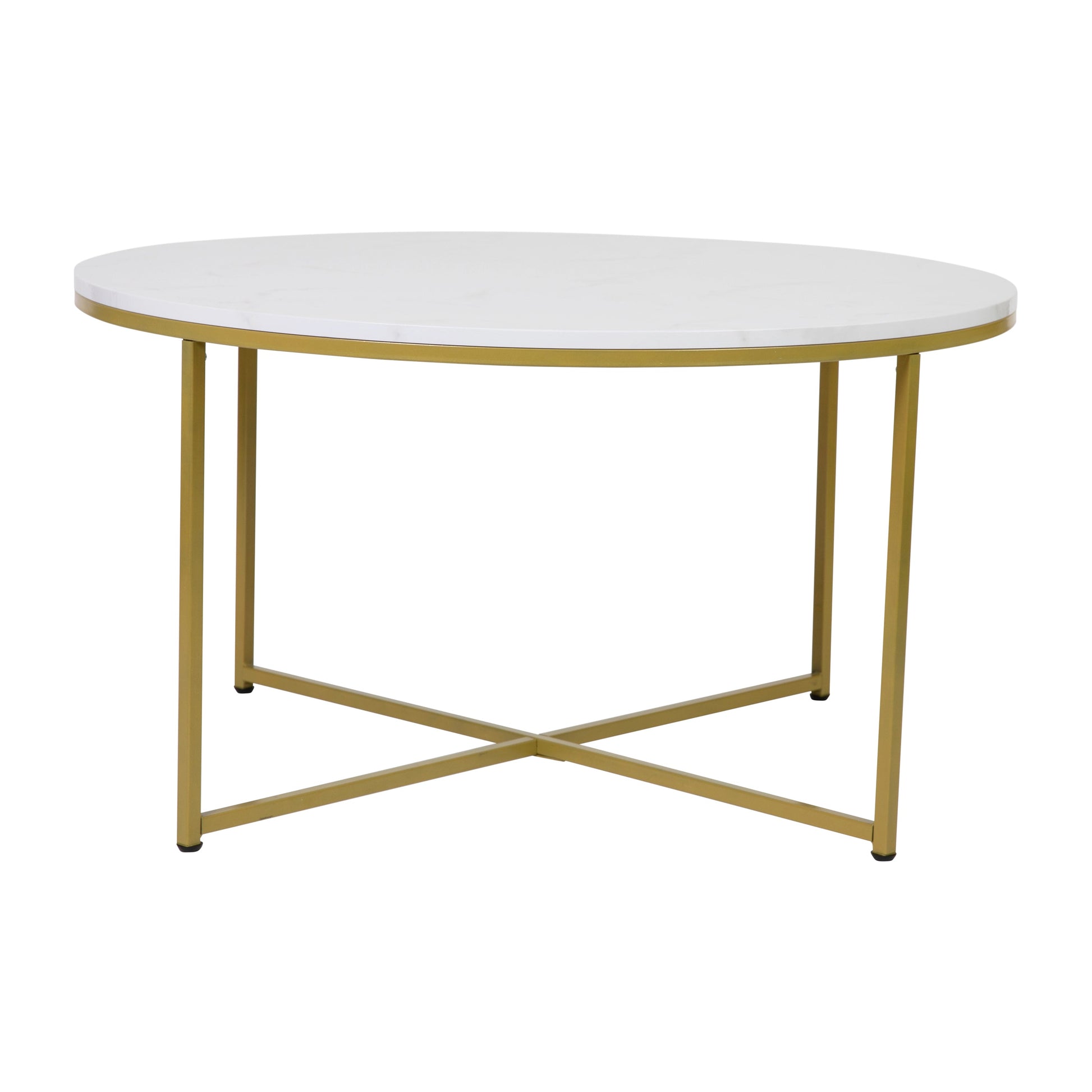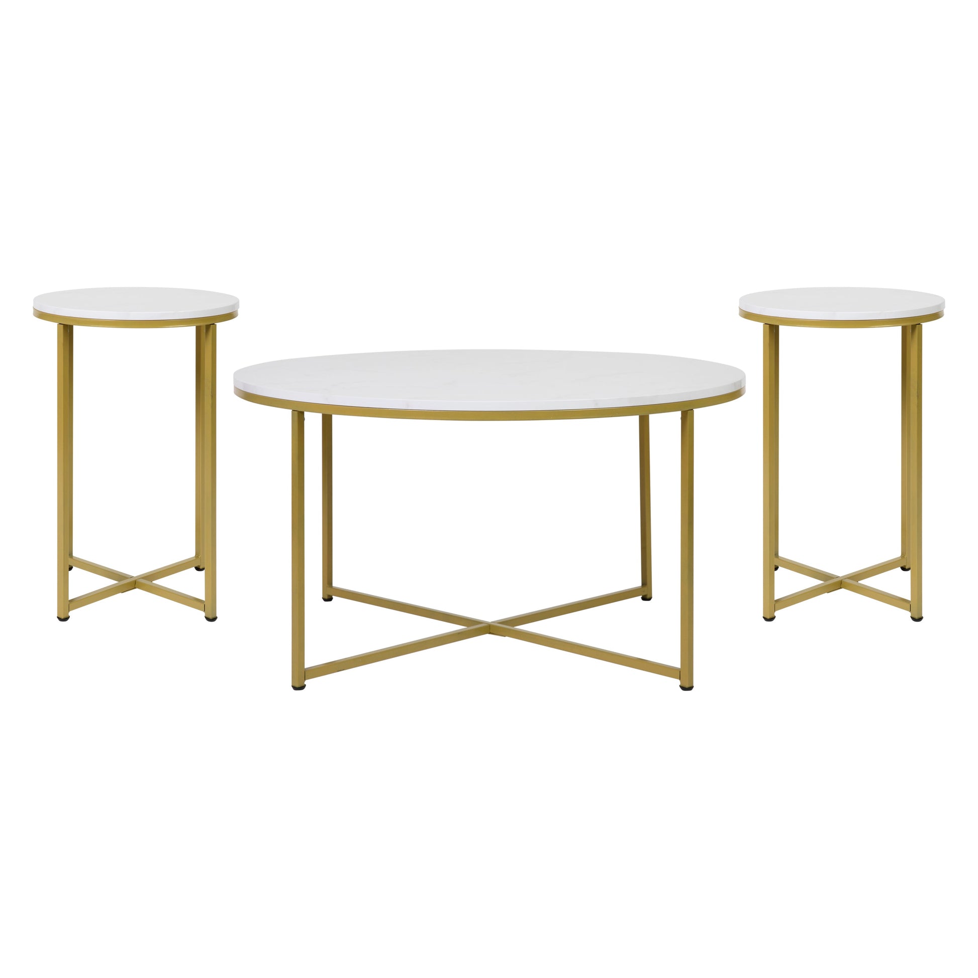 Hampstead Collection Coffee and End Table Set - White Marbled Laminate Top & Brushed Gold Crisscross Frame, 3 Piece Table Set Dimensions: 15.75" - 35.5"W x 15.75" - 35.5"D x 19.25" - 24"H