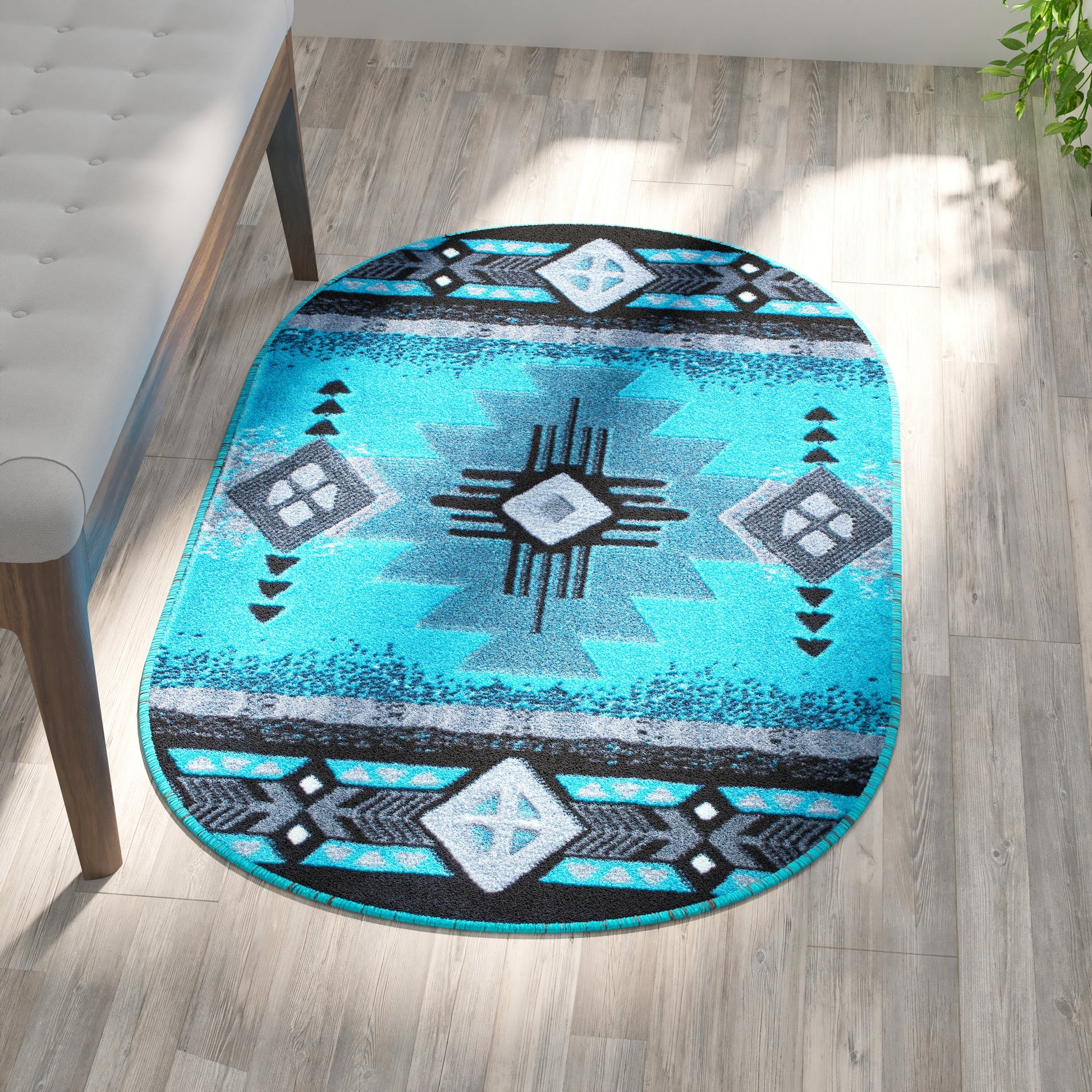 Mohave Collection 3' x 5' Oval Turquoise Traditional Southwestern Style Area Rug - Olefin Fibers with Jute Backing Dimensions: 36"W x 57.6"D x 0.5"H