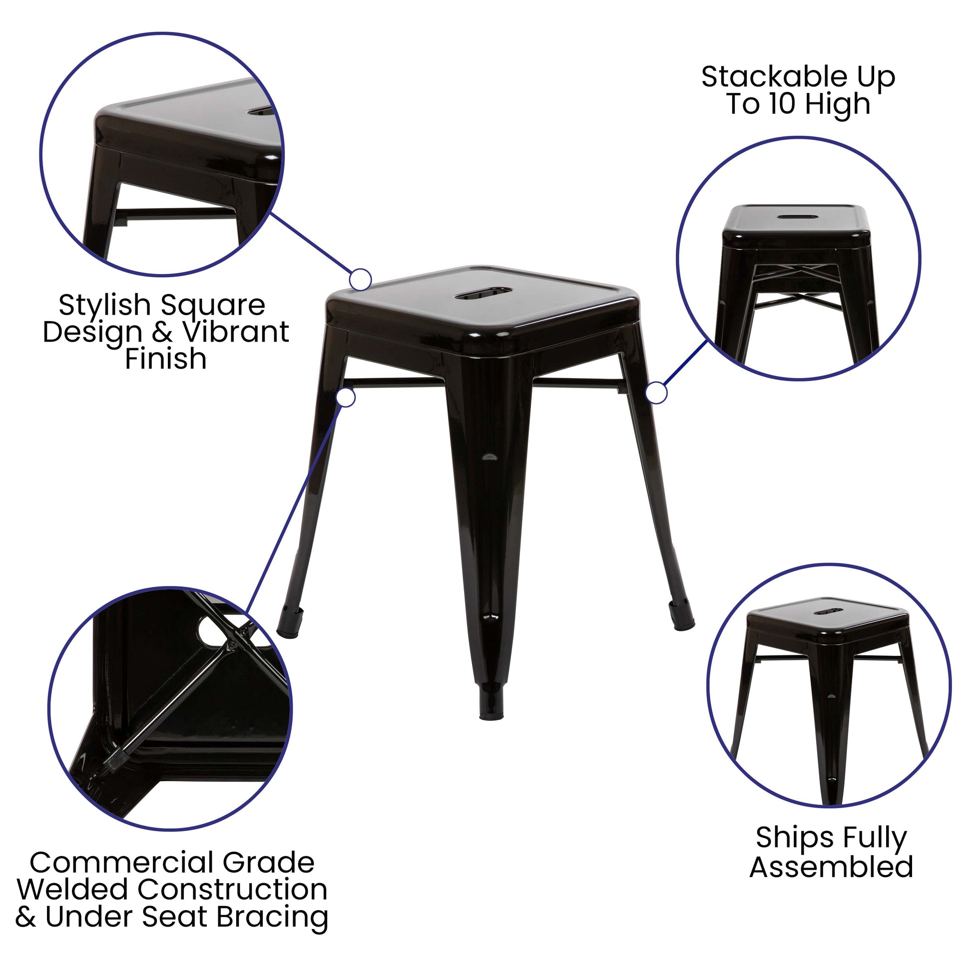 Kai 18" Table Height Stool, Stackable Backless Metal Indoor Dining Stool, Commercial Grade Restaurant Stool in Black - Set of 4 Dimensions: 15.75"W x 15.75"D x 18"H