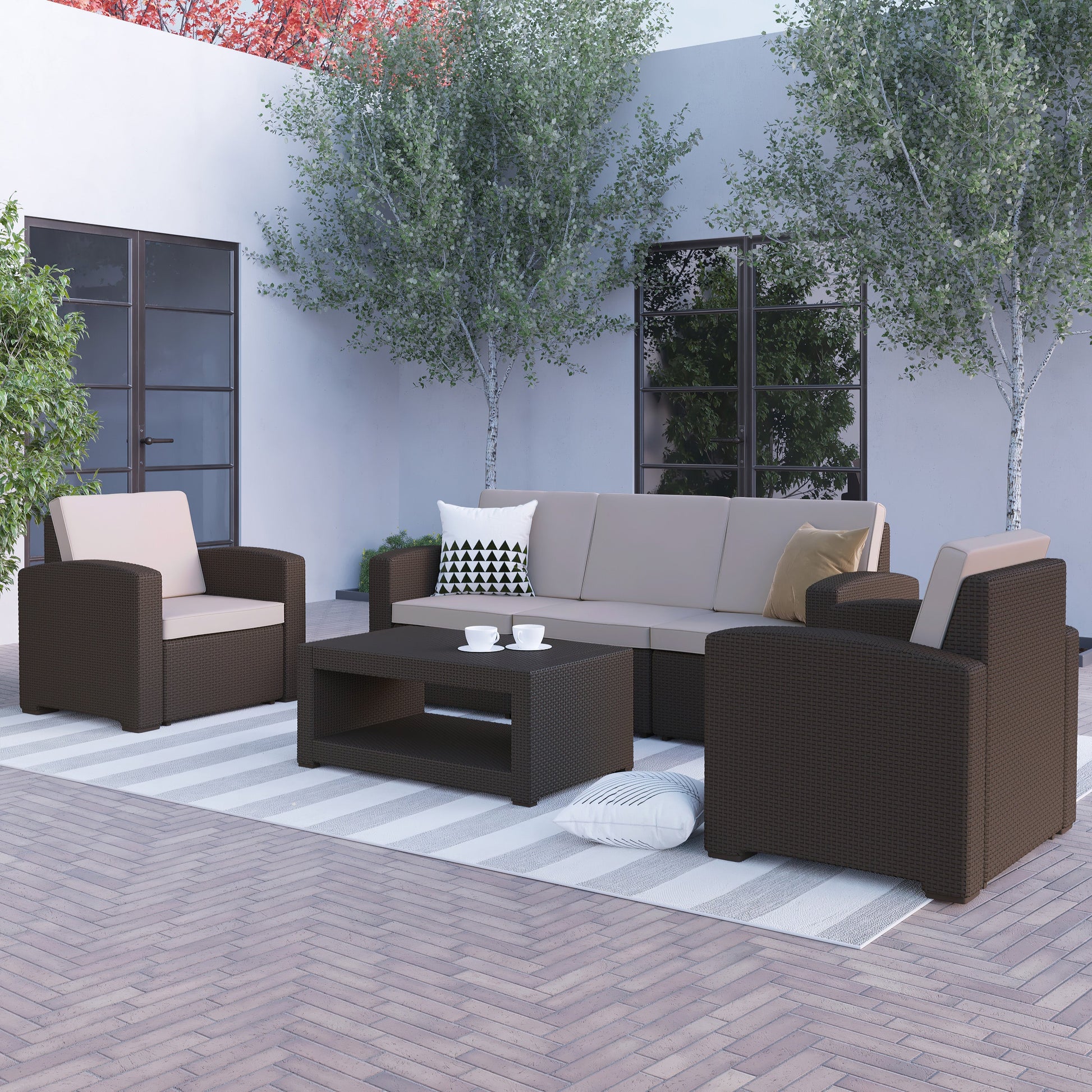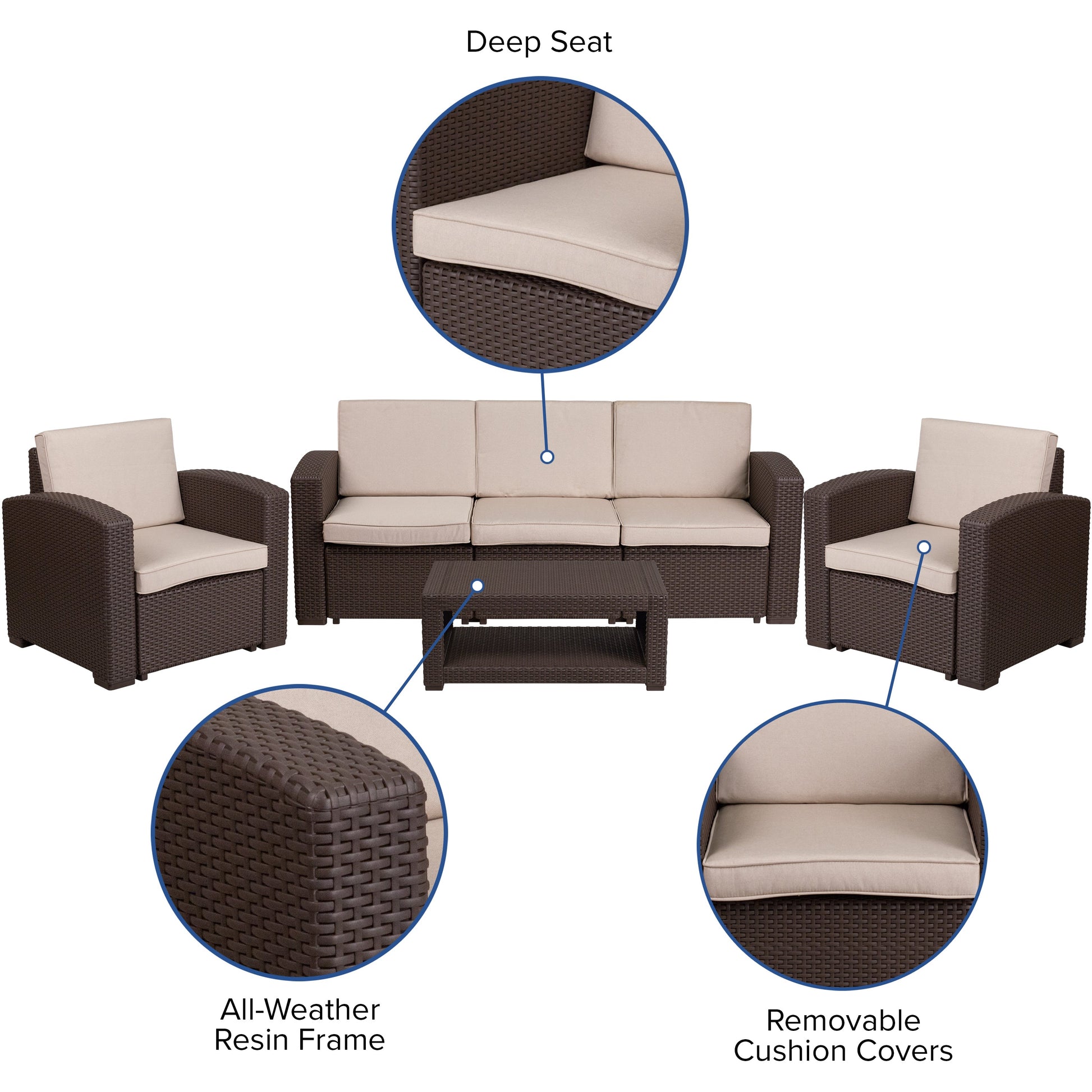 Seneca 4 Piece Outdoor Faux Rattan Chair, Sofa and Table Set in Seneca Chocolate Brown Dimensions: 32.75" - 78.5"W x 28"D x 32"H