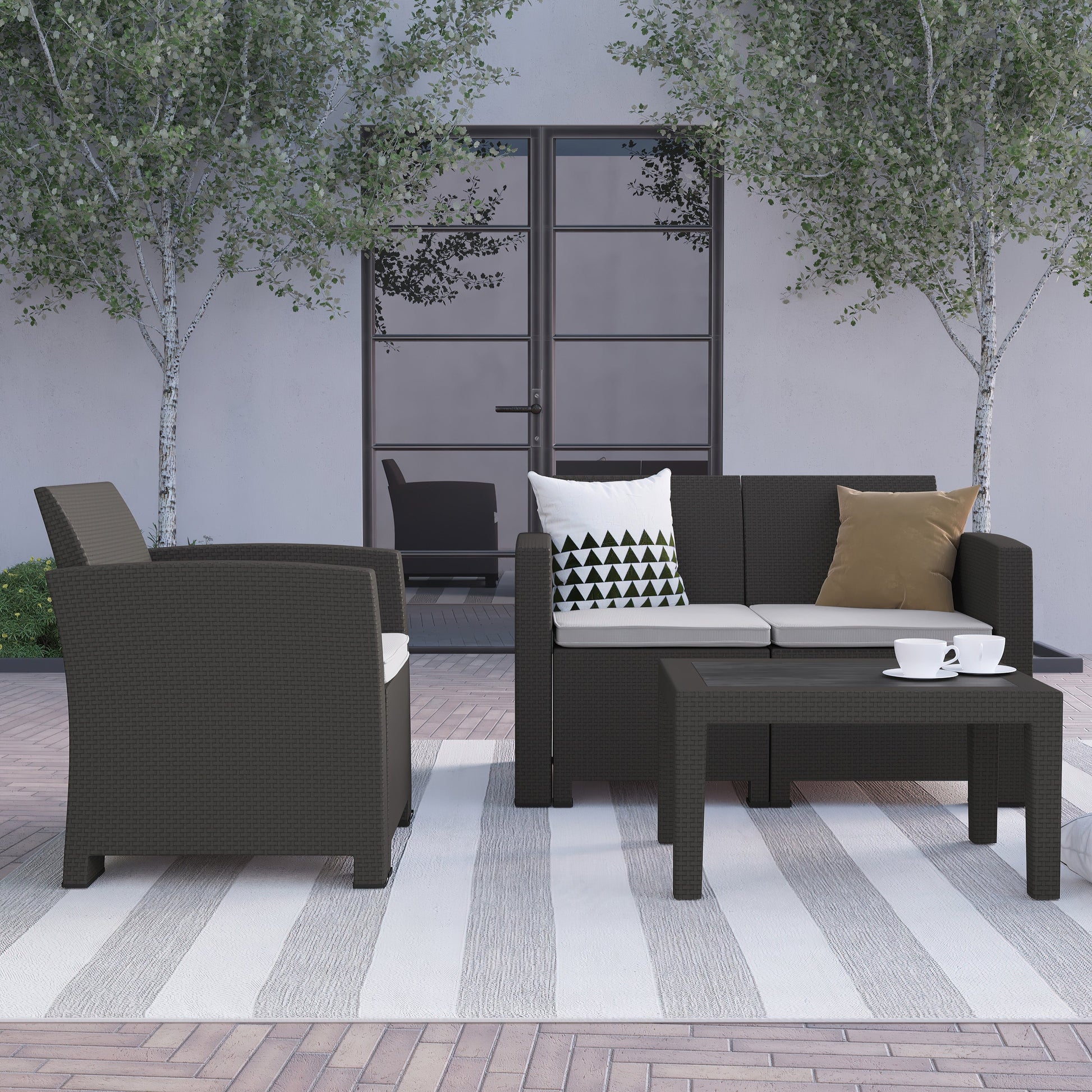 Seneca 4 Piece Outdoor Faux Rattan Chair, Loveseat and Table Set in Seneca Dark Gray Dimensions: 26.75" - 47"W x 27"D x 30"H