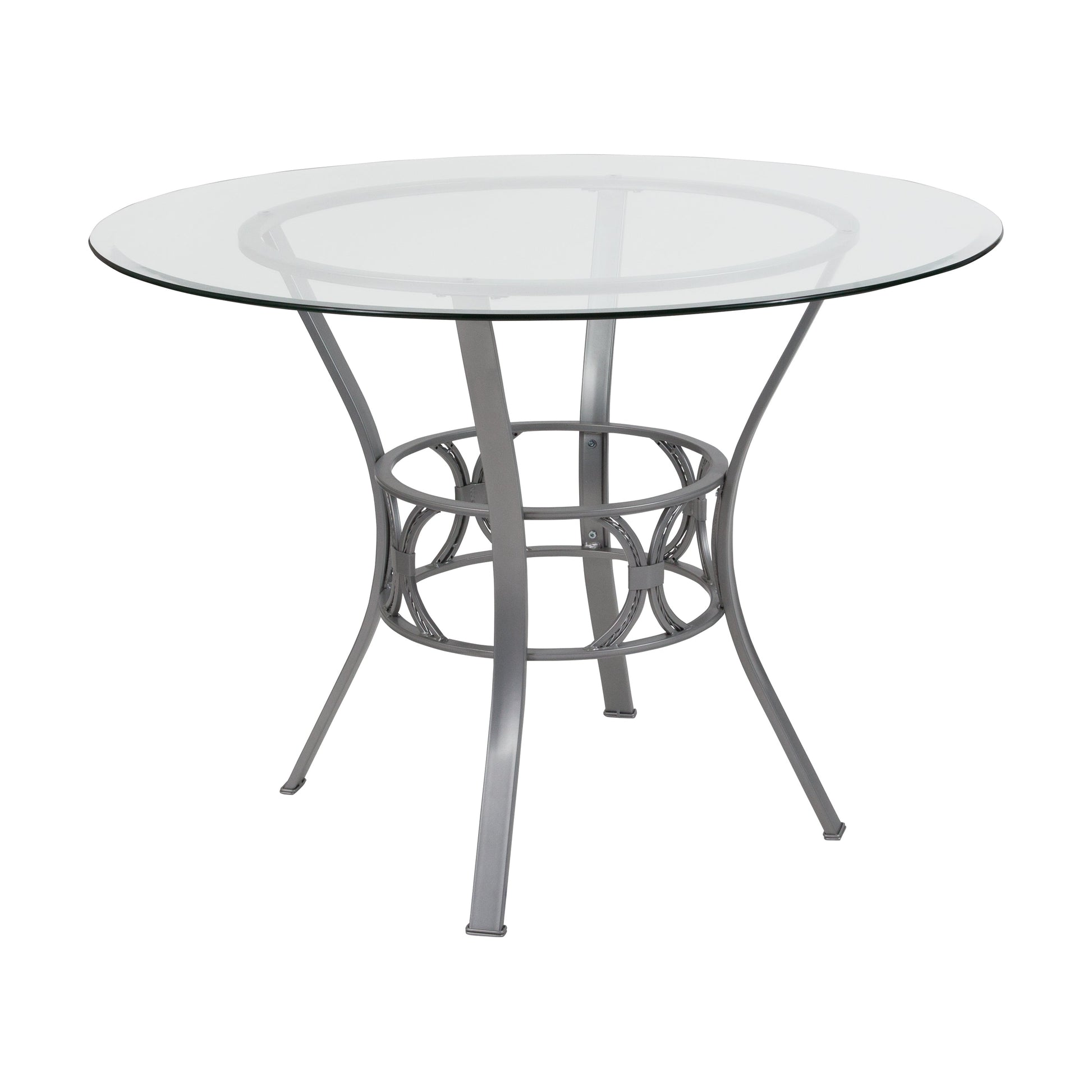 Carlisle 42'' Round Glass Dining Table with Silver Metal Frame Dimensions: 42"W x 42"D x 29.5"H