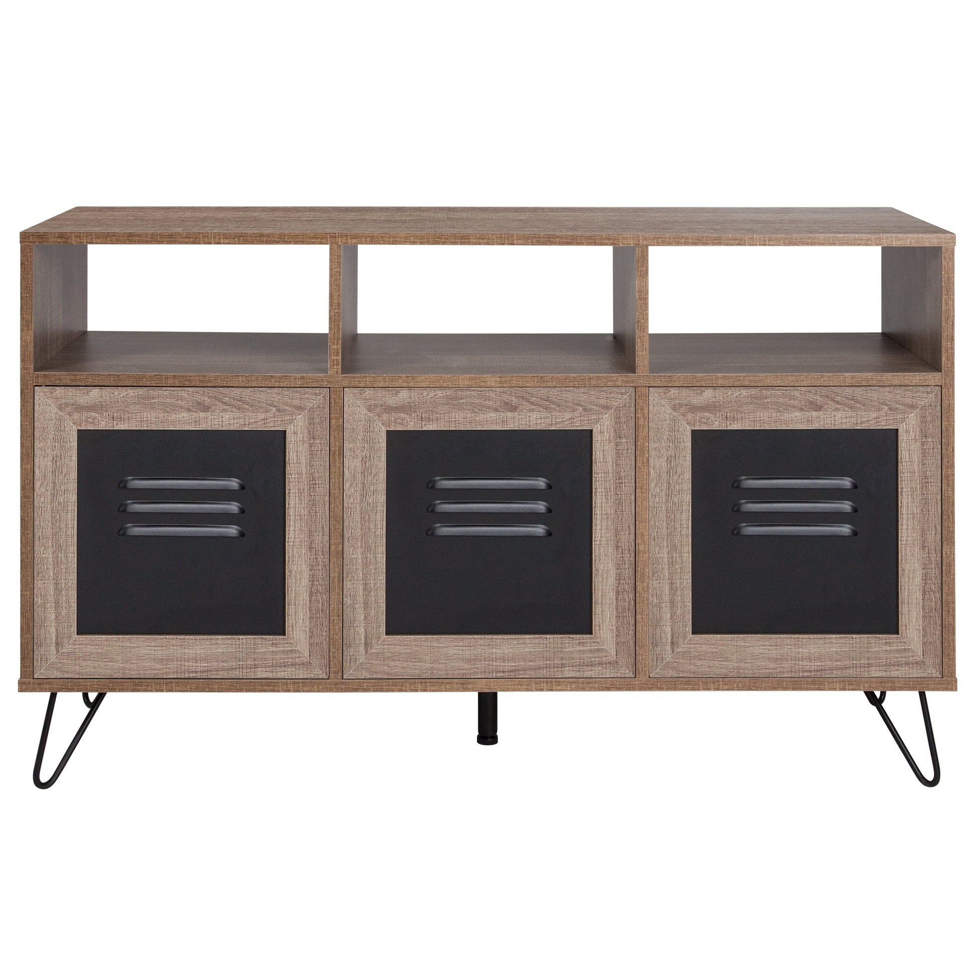 Woodridge Collection 44"W 3 Shelf Storage Console/Cabinet with Metal Doors in Rustic Wood Grain Finish Dimensions: 44"W x 13.75"D x 26.5"H