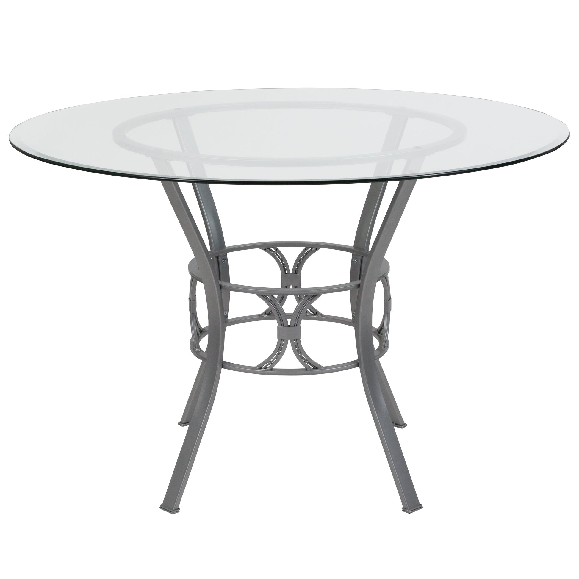 Carlisle 45'' Round Glass Dining Table with Silver Metal Frame Dimensions: 45"W x 45"D x 29.5"H