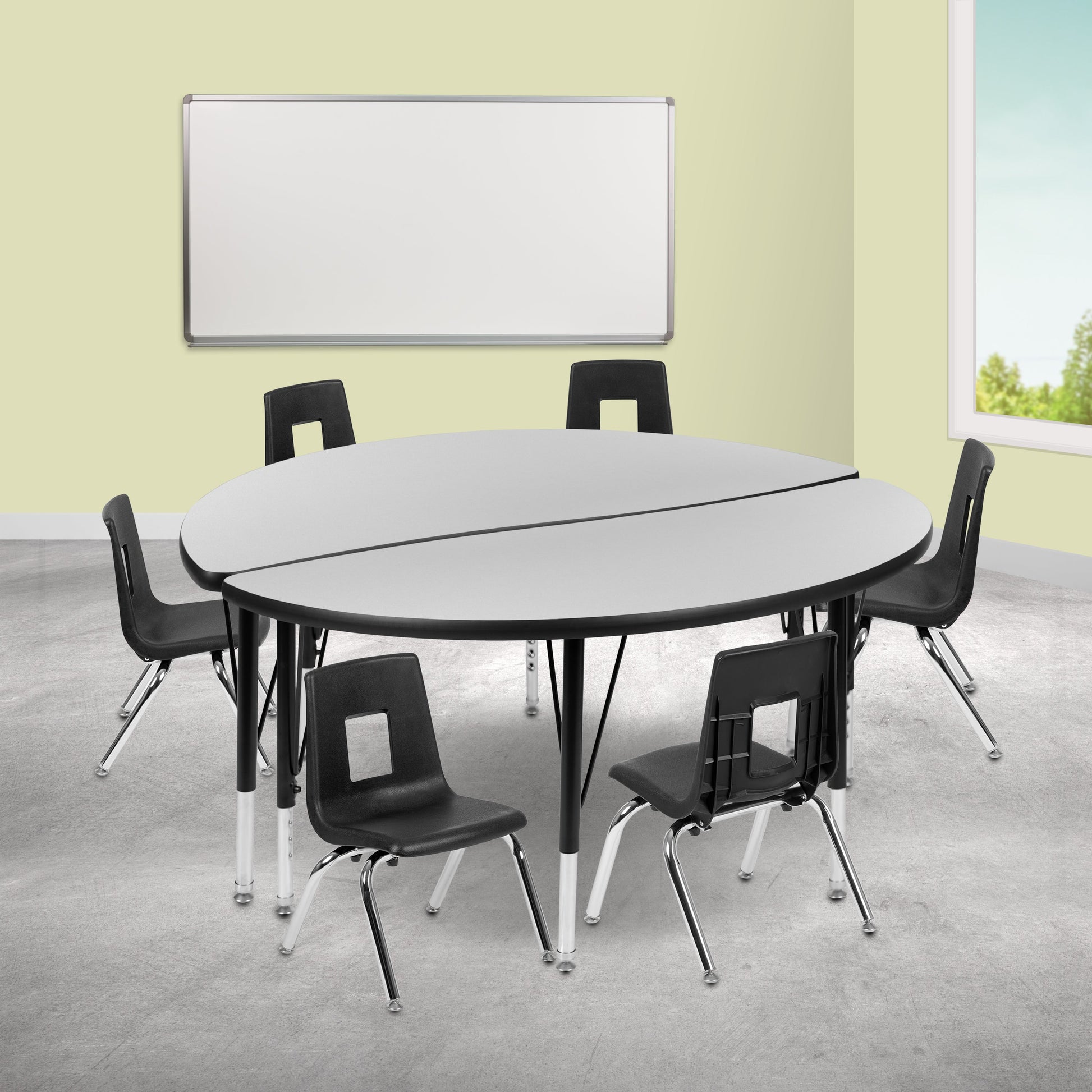 Emmy 47.5" Circle Wave Flexible Laminate Activity Table Set with 14" Student Stack Chairs, Grey/Black Dimensions: 47.5"W x 48"D x 16.25" - 25.25"H