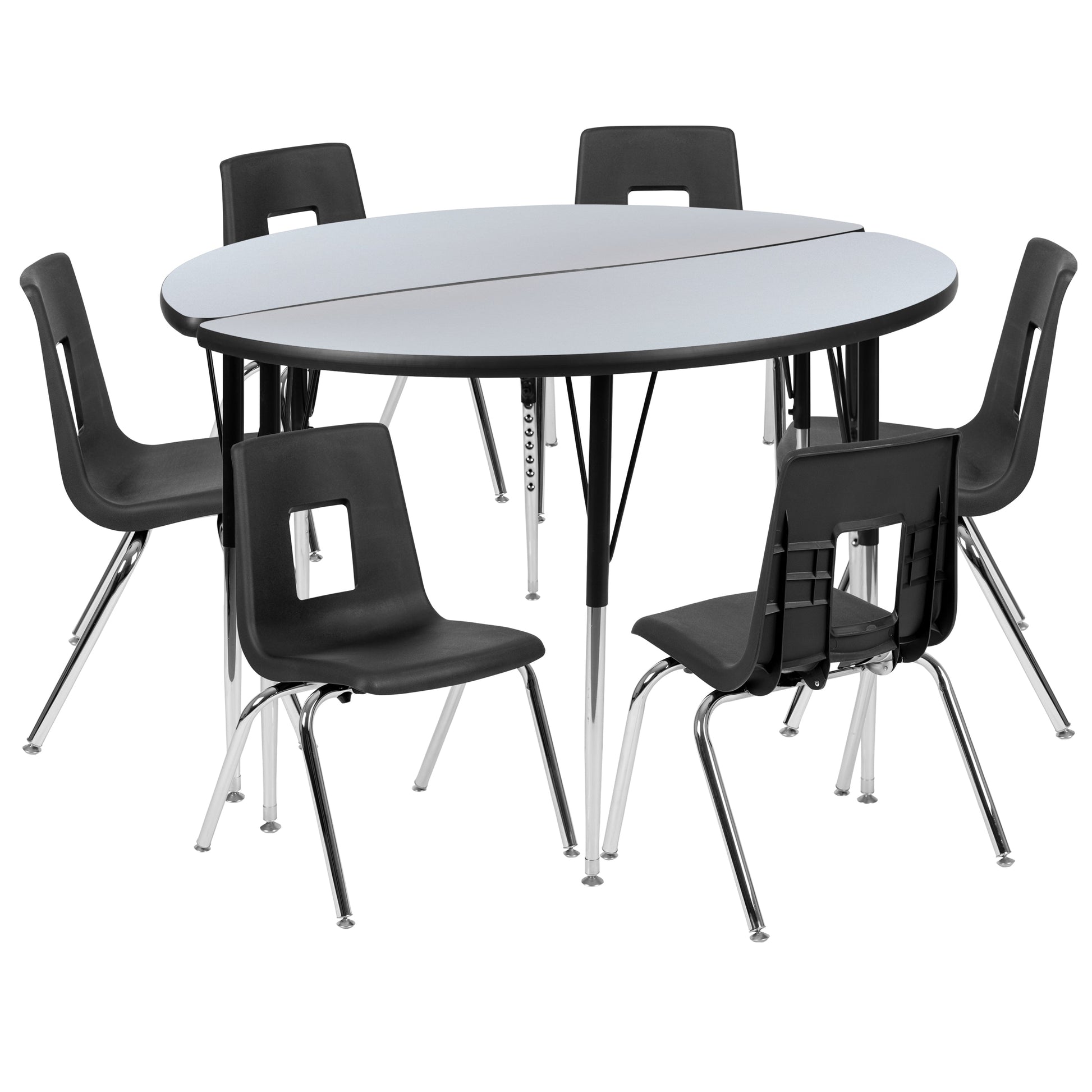 Emmy 47.5" Circle Wave Flexible Laminate Activity Table Set with 16" Student Stack Chairs, Grey/Black Dimensions: 47.5"W x 48"D x 21.25" - 30.25"H
