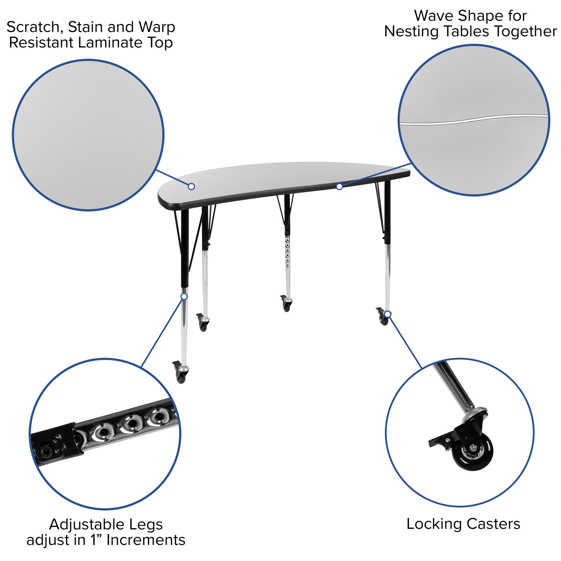 Emmy Mobile 47.5" Circle Wave Flexible Laminate Activity Table Set with 18" Student Stack Chairs, Grey/Black Dimensions: 47.5"W x 48"D x 22" - 30"H