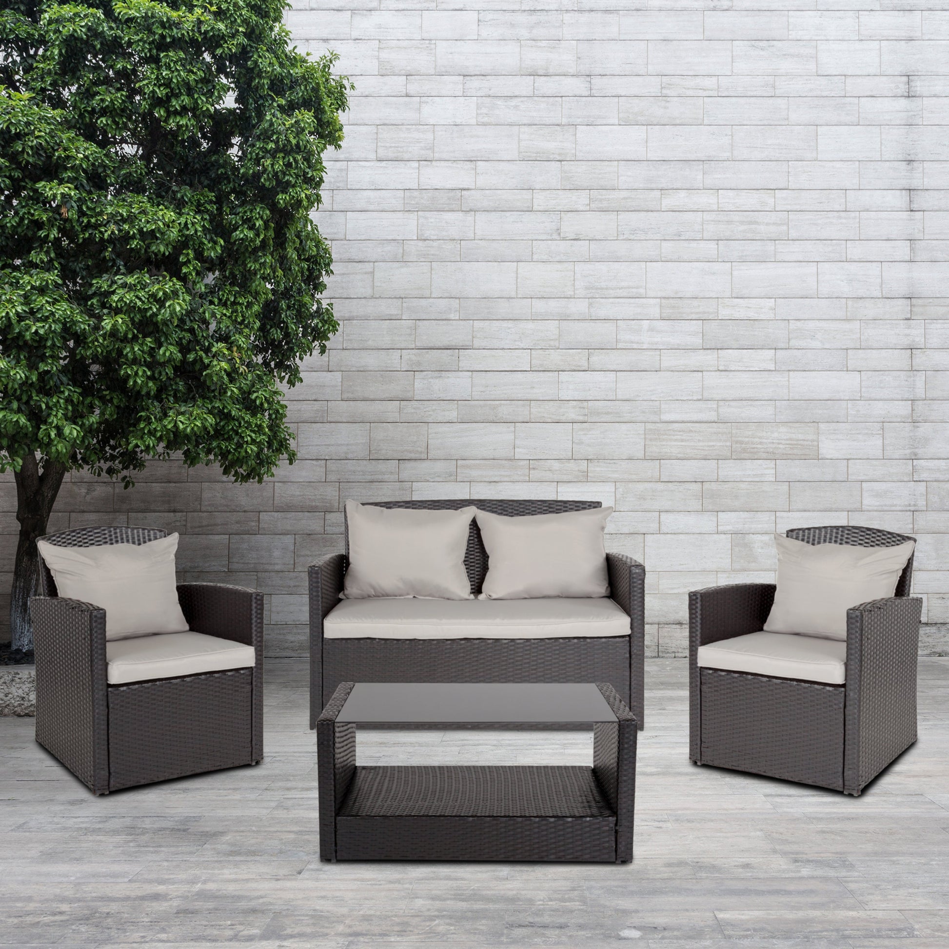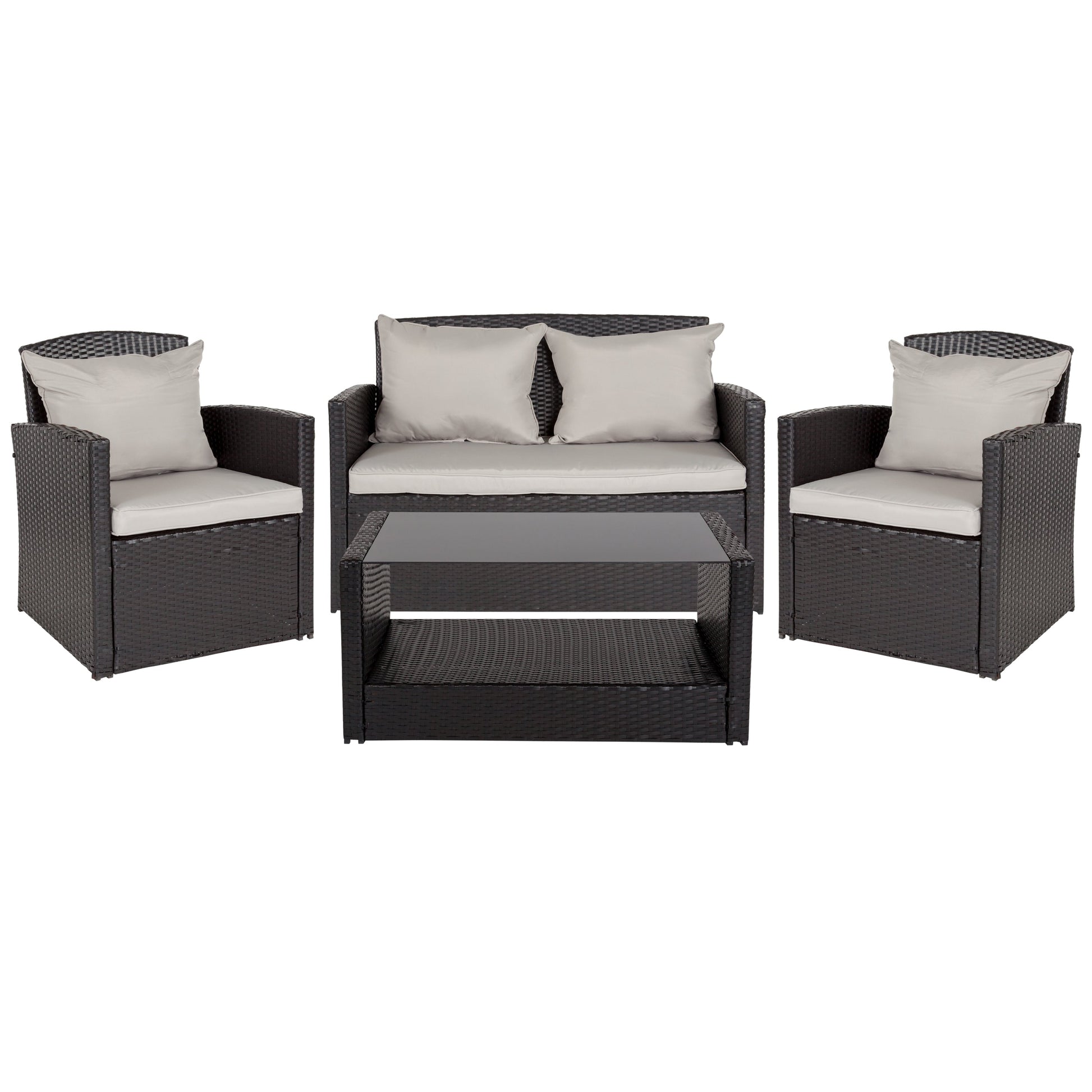 Aransas Series 4 Piece Black Patio Set with Gray Back Pillows and Seat Cushions Dimensions: 25.5" - 47.25"W x 22" - 23"D x 30" - 30.5"H