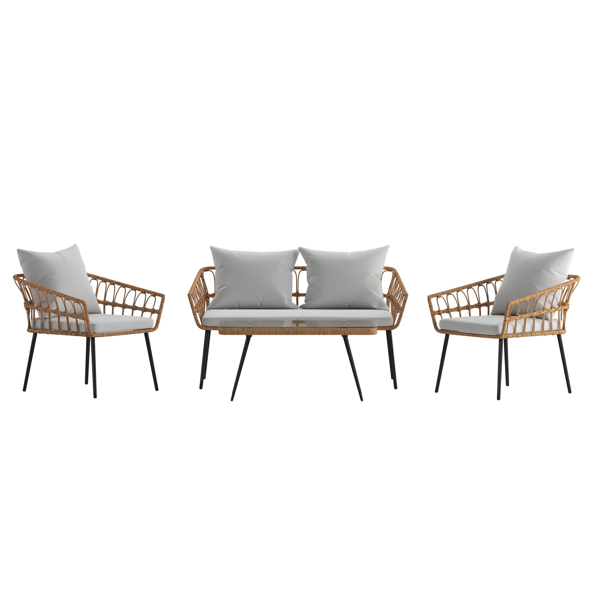 Evin Boho 4 Piece Indoor/Outdoor Rope Rattan Patio Conversation Set with Tempered Glass Top Coffee Table and Gray Cushions, Natural Dimensions: 52.25"W x 27.5"D x 27.5"H