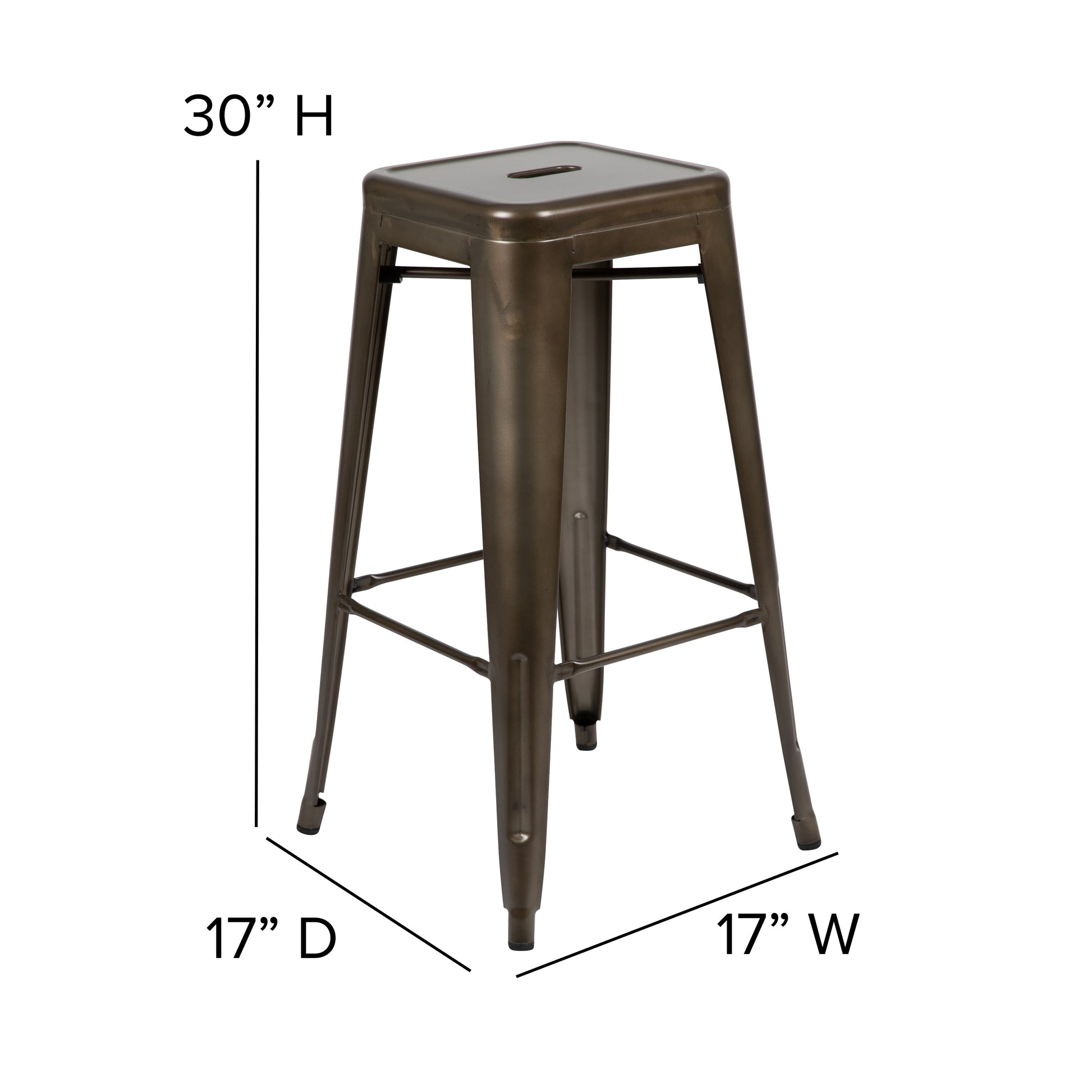 Cierra Set of 4 Commercial Grade 30" High Backless Gunmetal Metal Indoor Bar Height Stools with Black All-Weather Poly Resin Seats Dimensions: 17"W x 17"D x 30.75"H