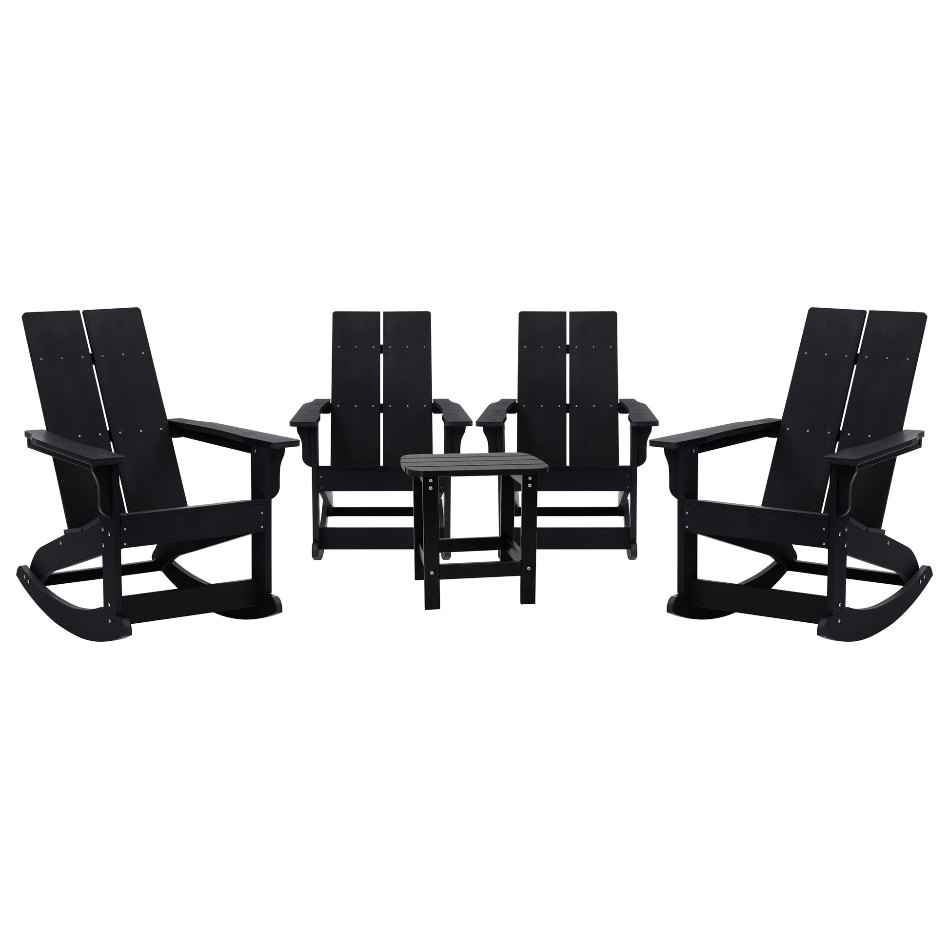Set of 4 Black Finn Modern Commercial Grade All-Weather 2-Slat Poly Resin Rocking Adirondack Chairs with Matching Side Table Dimensions: 29"W x 38"D x 40.5"H