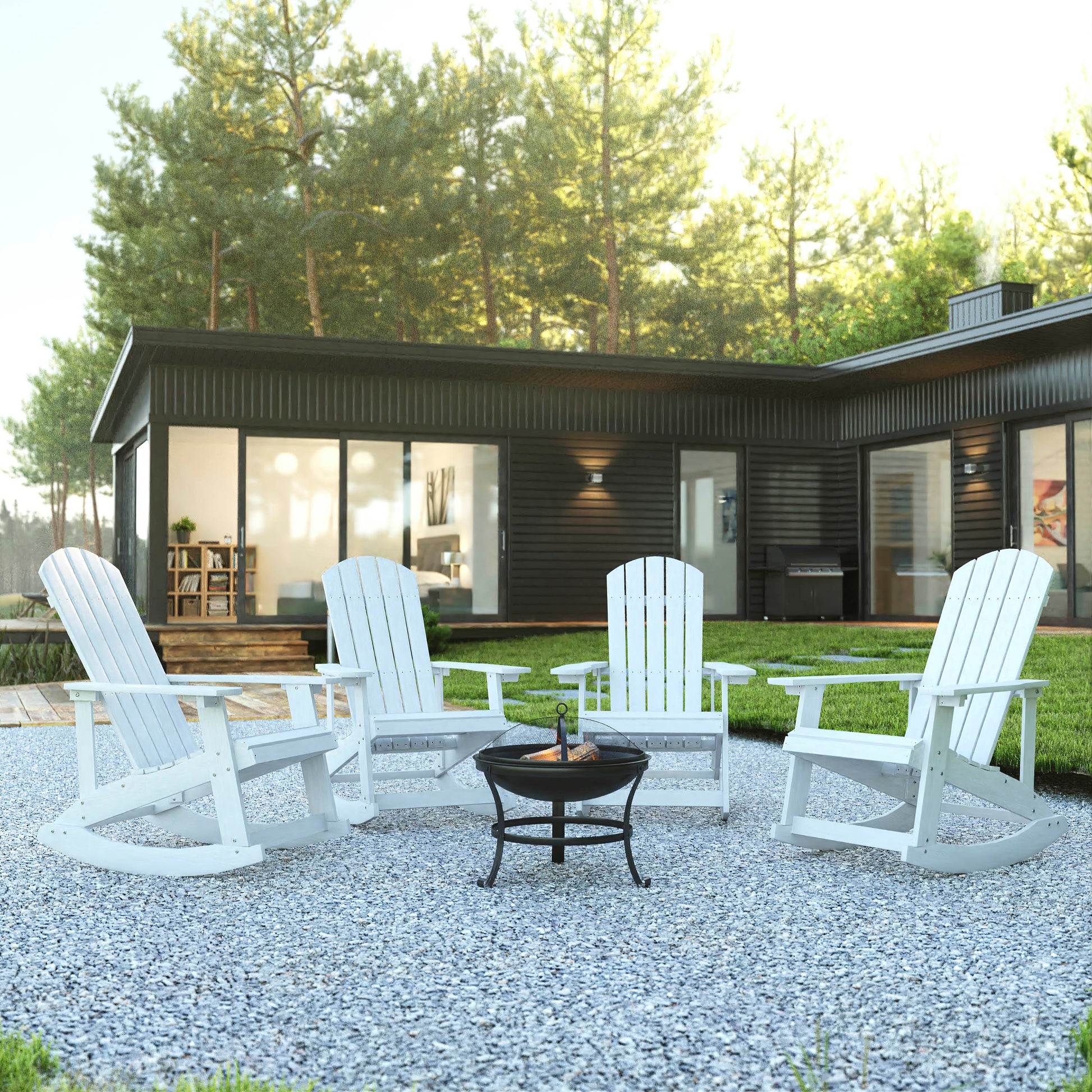 Savannah Set of 4 White Commercial Grade All-Weather Poly Resin Wood Adirondack Rocking Chairs with 22" Round Wood Burning Fire Pit Dimensions: 29.5"W x 37.75"D x 39.5"H