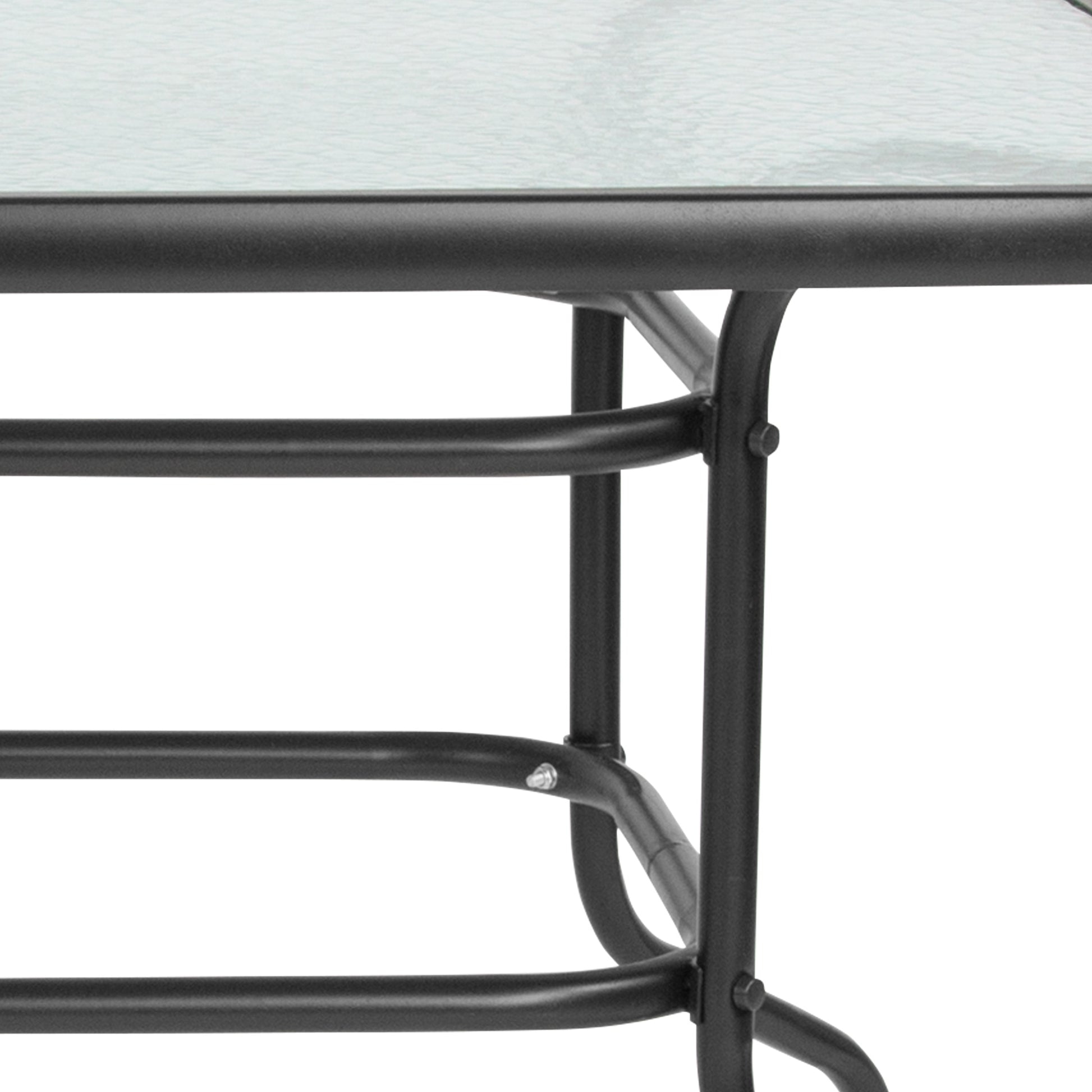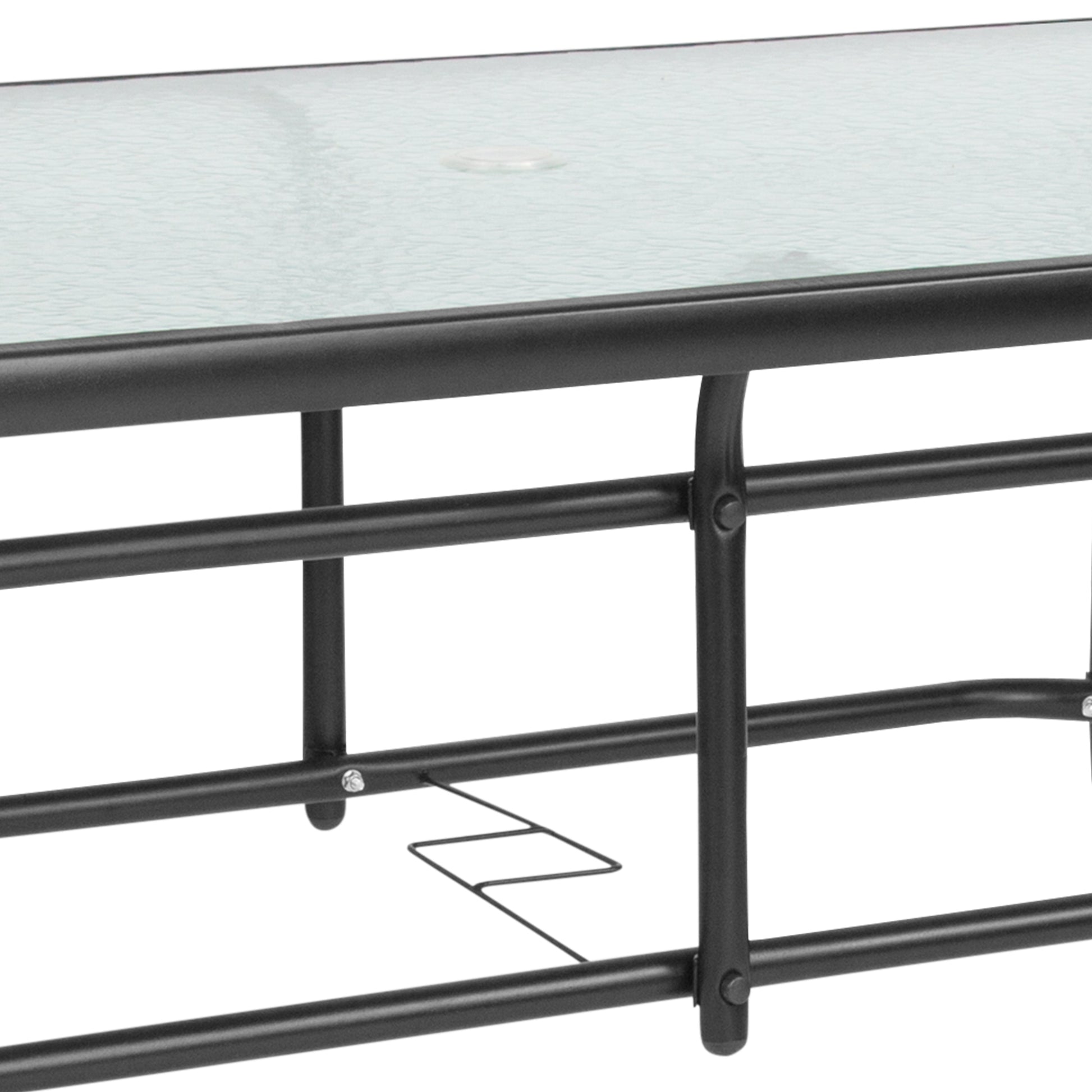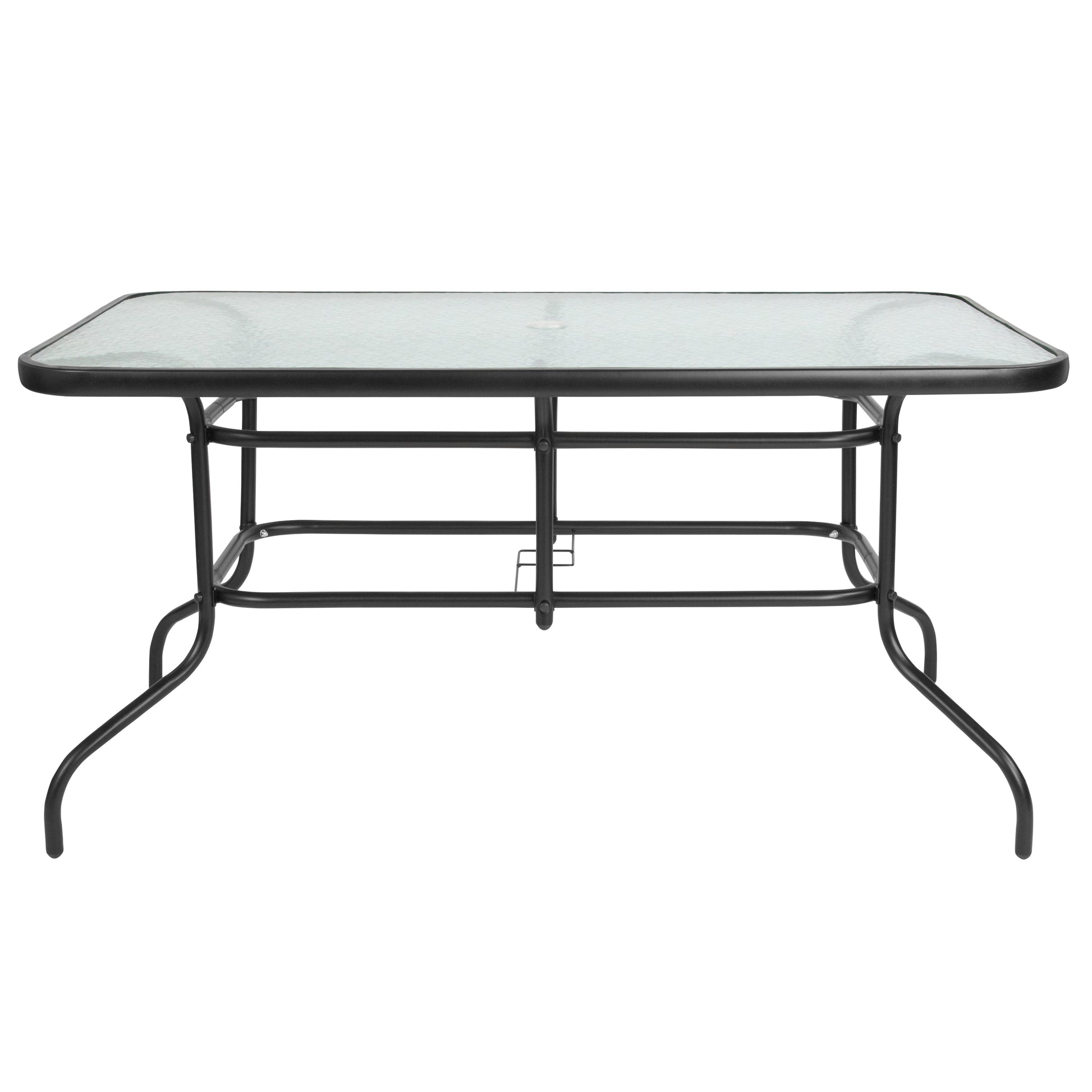 Tory 31.5" x 55" Rectangular Tempered Glass Metal Table with Umbrella Hole Dimensions: 31.5"W x 55"D x 27.5"H